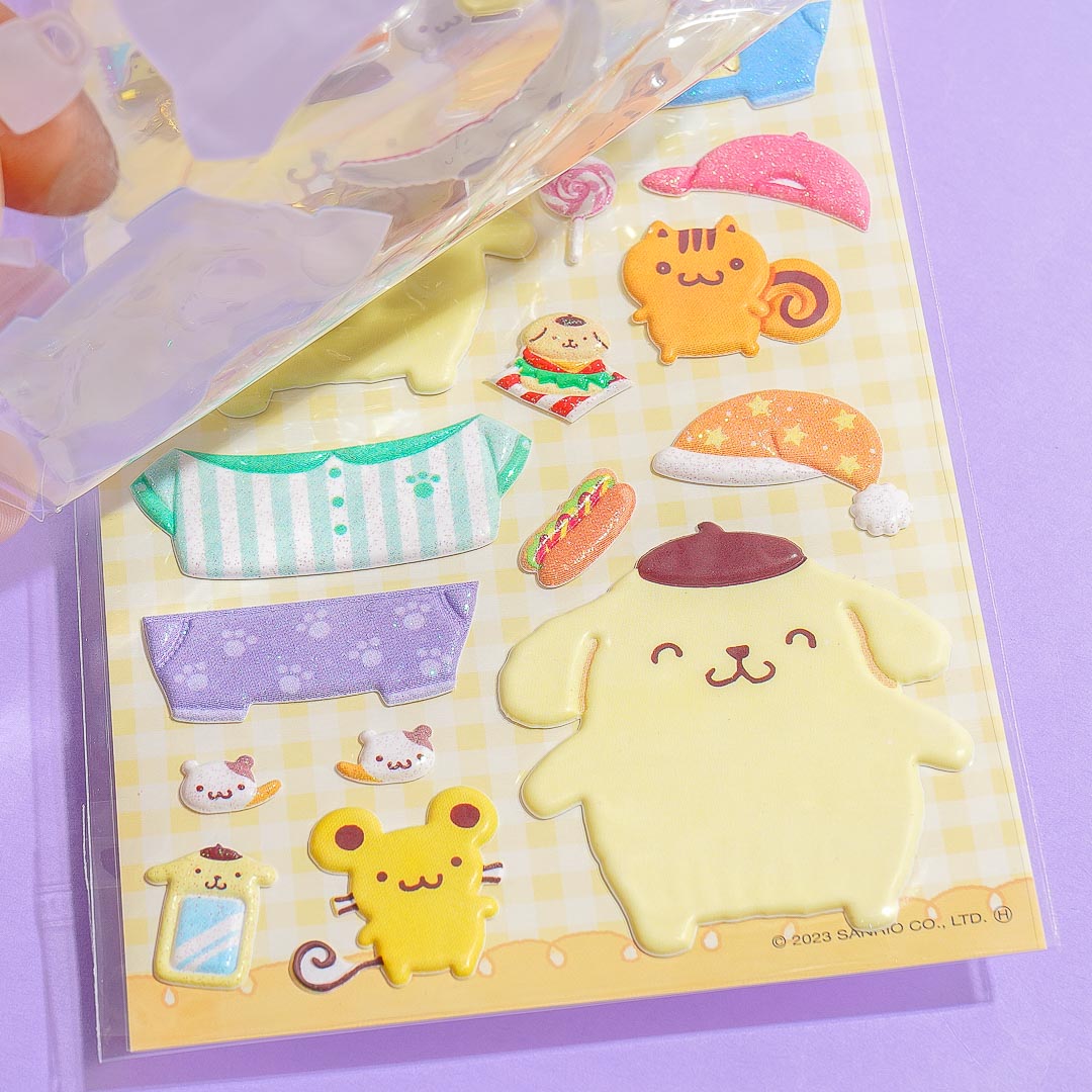 Mix and match Pompompurin's daily outfits! This is a double-layered sticker sheet that comes with puffy stickers featuring Pompompurin and his different clothes. Use the stickers to decorate your journals after playing.