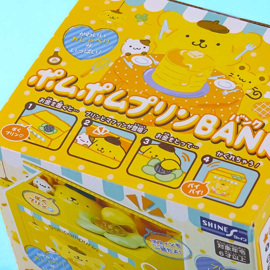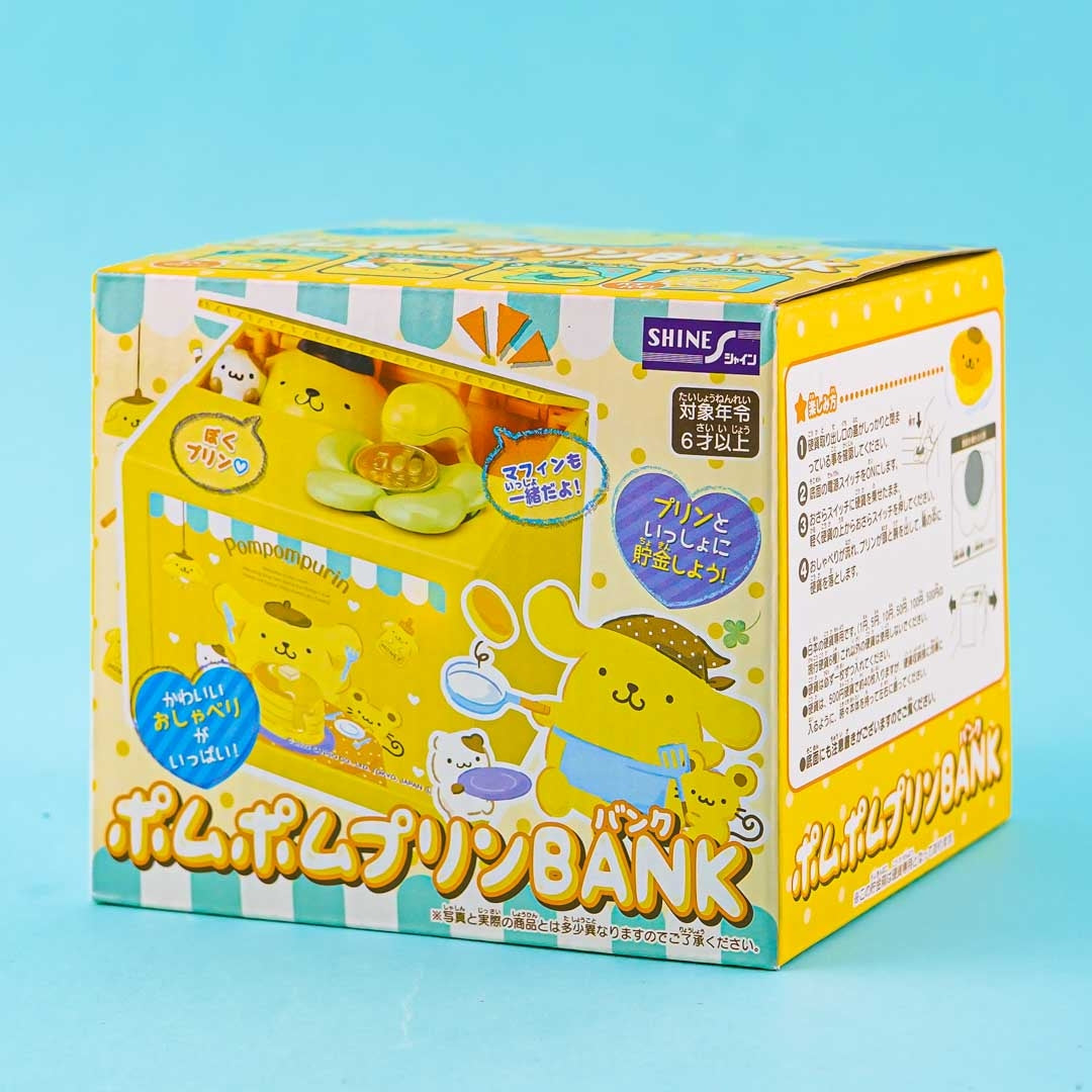 A kawaii box-shaped coin bank with a popping Pompompurin and Muffin
