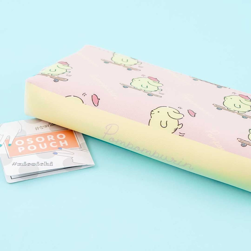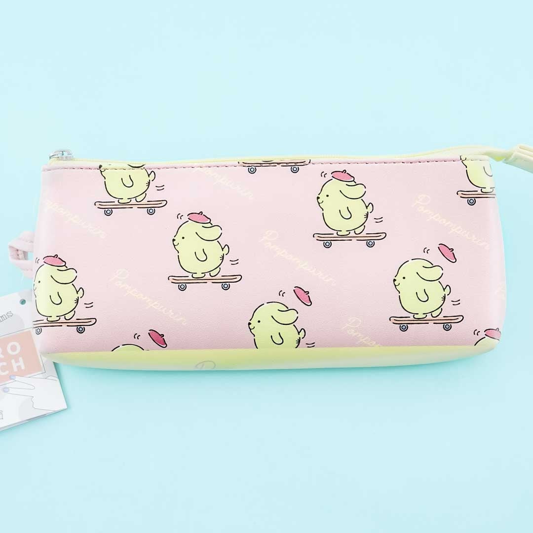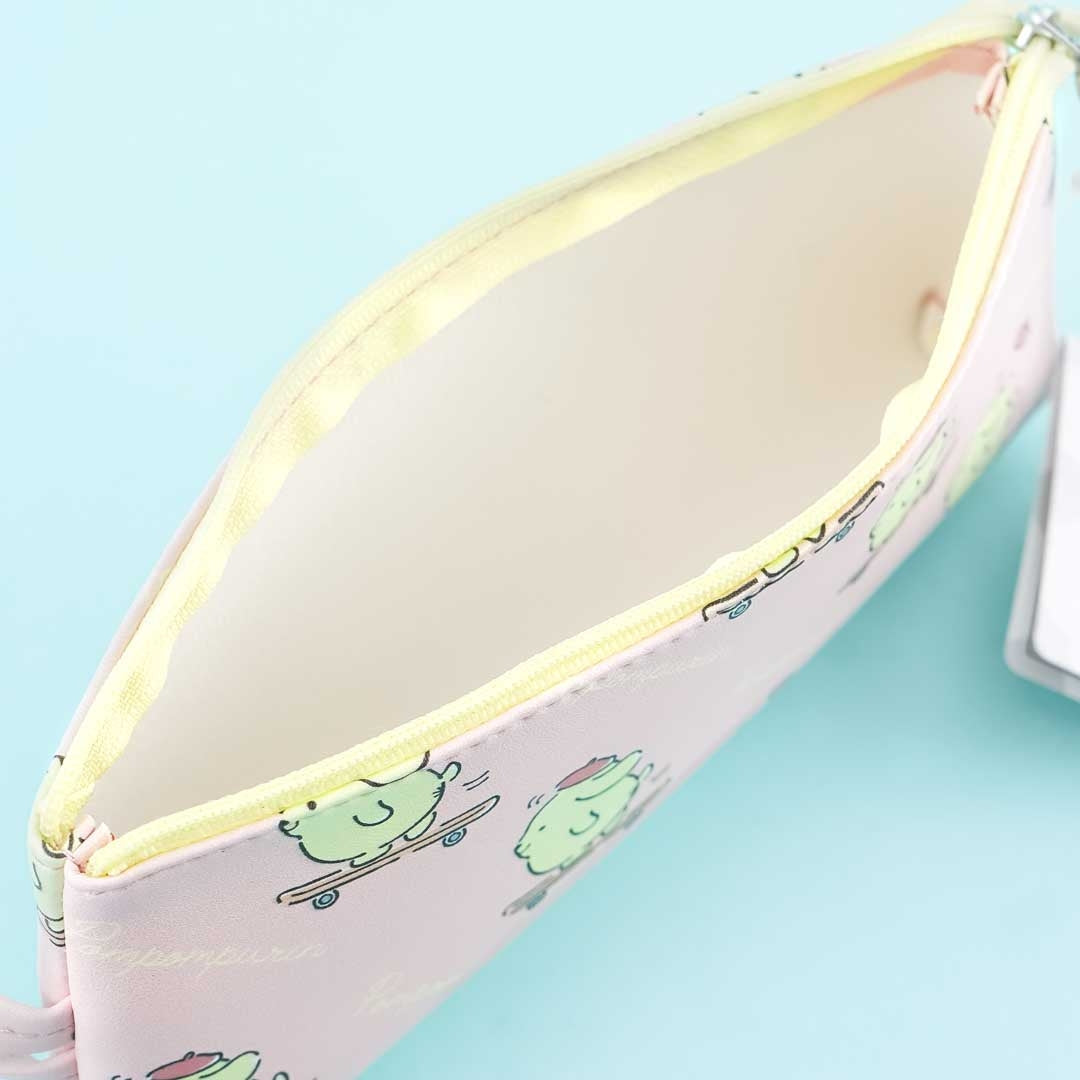 • A super cute pouch with multiple matching prints of Pompompurin in a skateboard