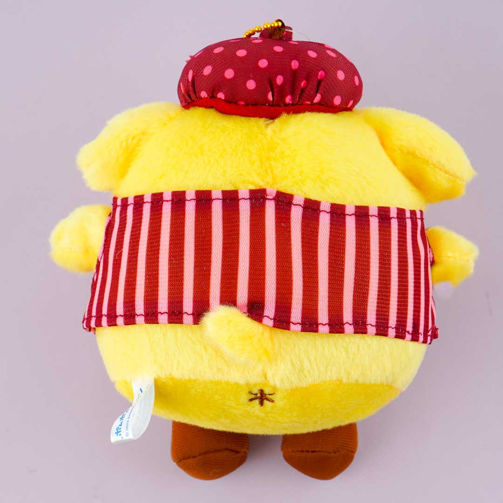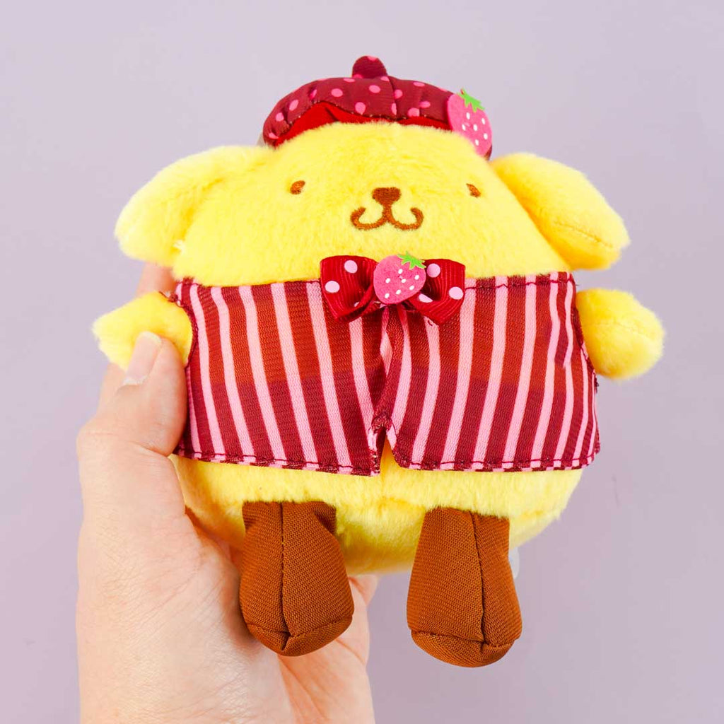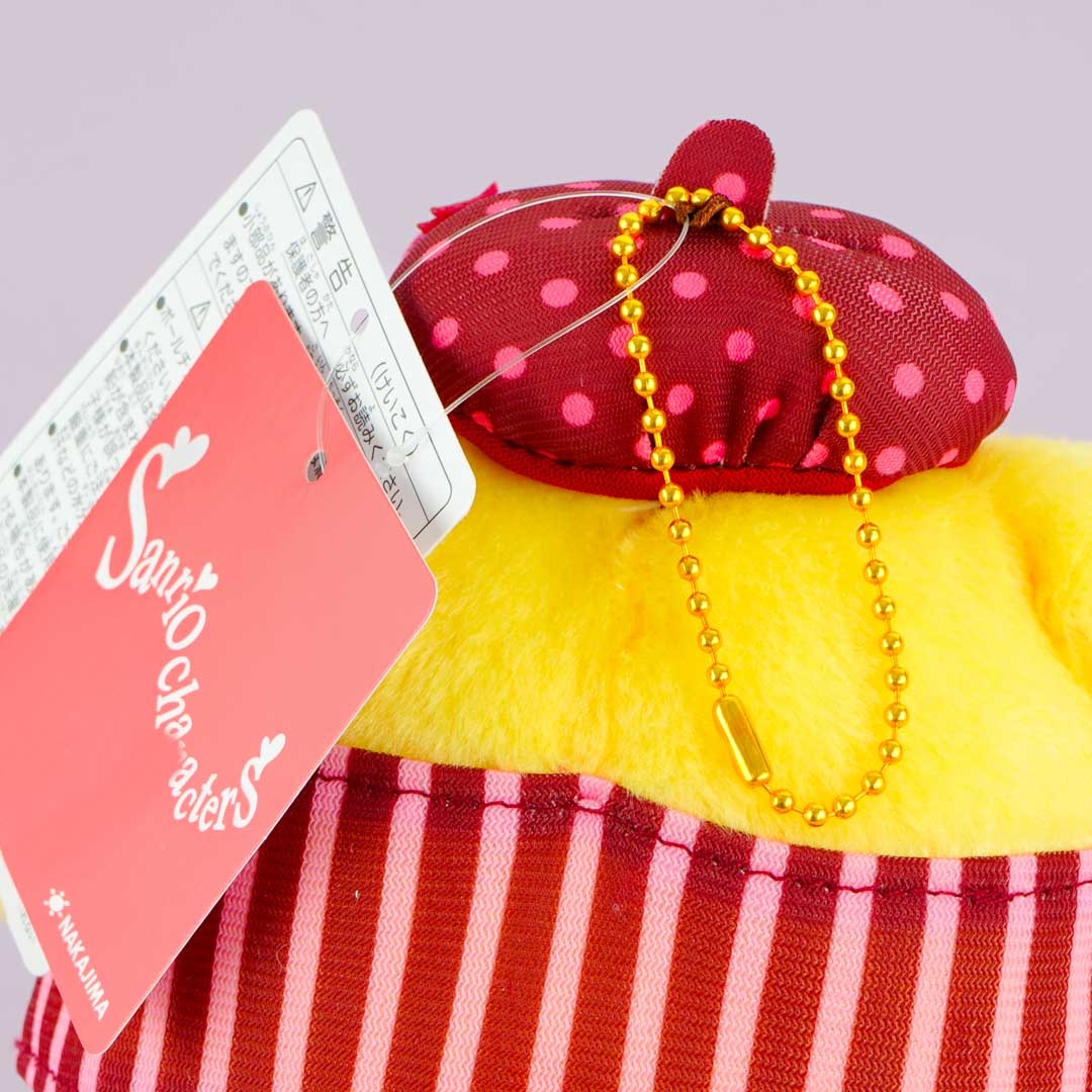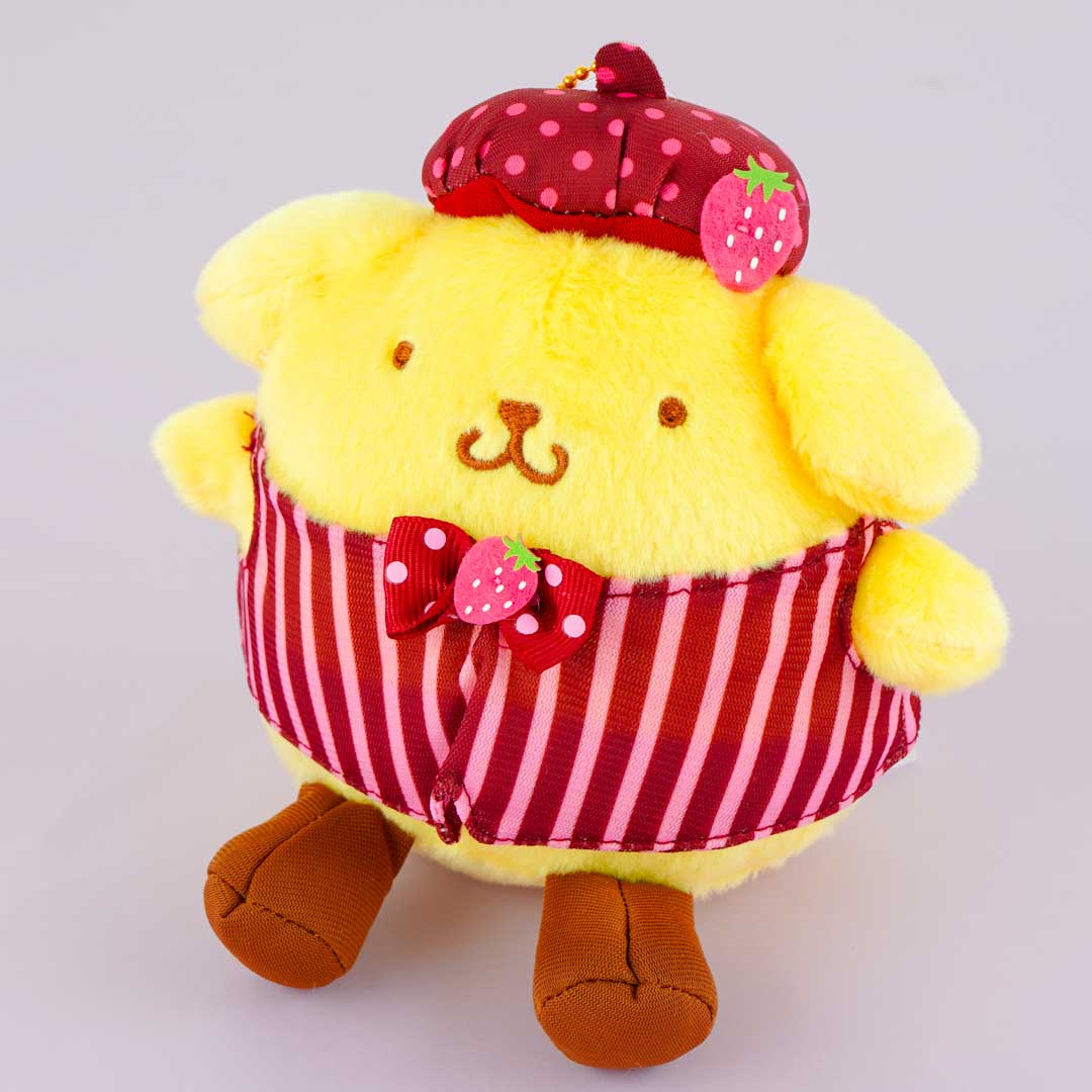 Have fun playing with this cute Pompompurin plushie that’s wearing a striped outfit and hat that are inspired by chocolate strawberry desserts! You can also attach this kawaii charm to your fave shoulder bag.