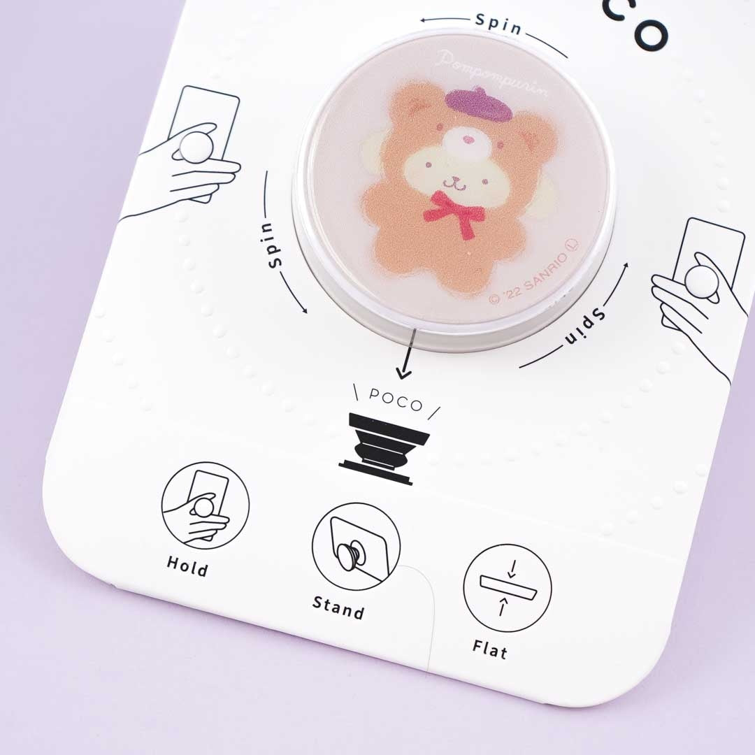 A kawaii smartphone ring illustrated with Pompompurin in a bear onesie