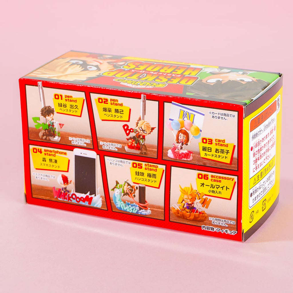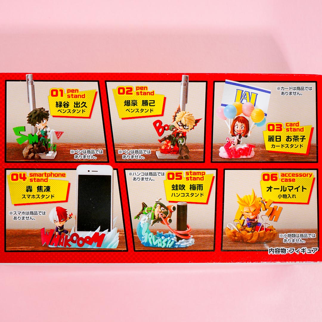 Series lineup: Izuku Midoriya Pen Stand, Katsuki Bakugo Pen Stan, Ochaco Uraraka Card Stand, Shoto Todoroki Smartphone Stand, Tsuyu Asui Stamp Stand, All Might Accessory Tray