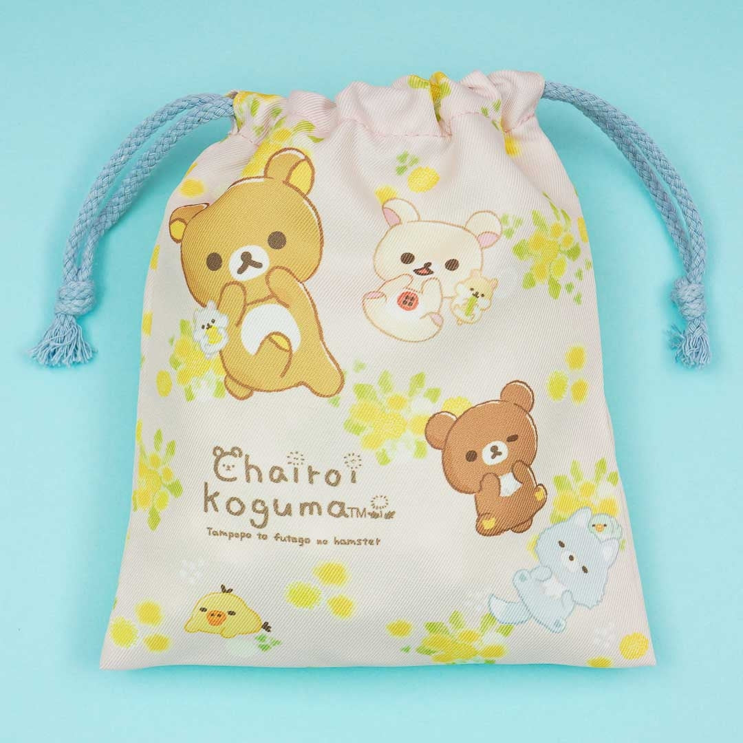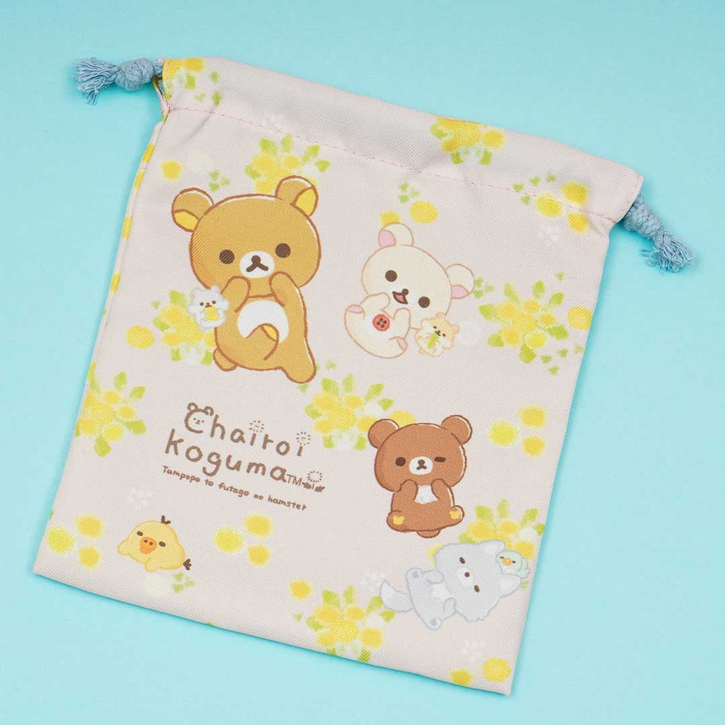 A cute drawstring pouch illustrated with Rilakkuma and his friends napping