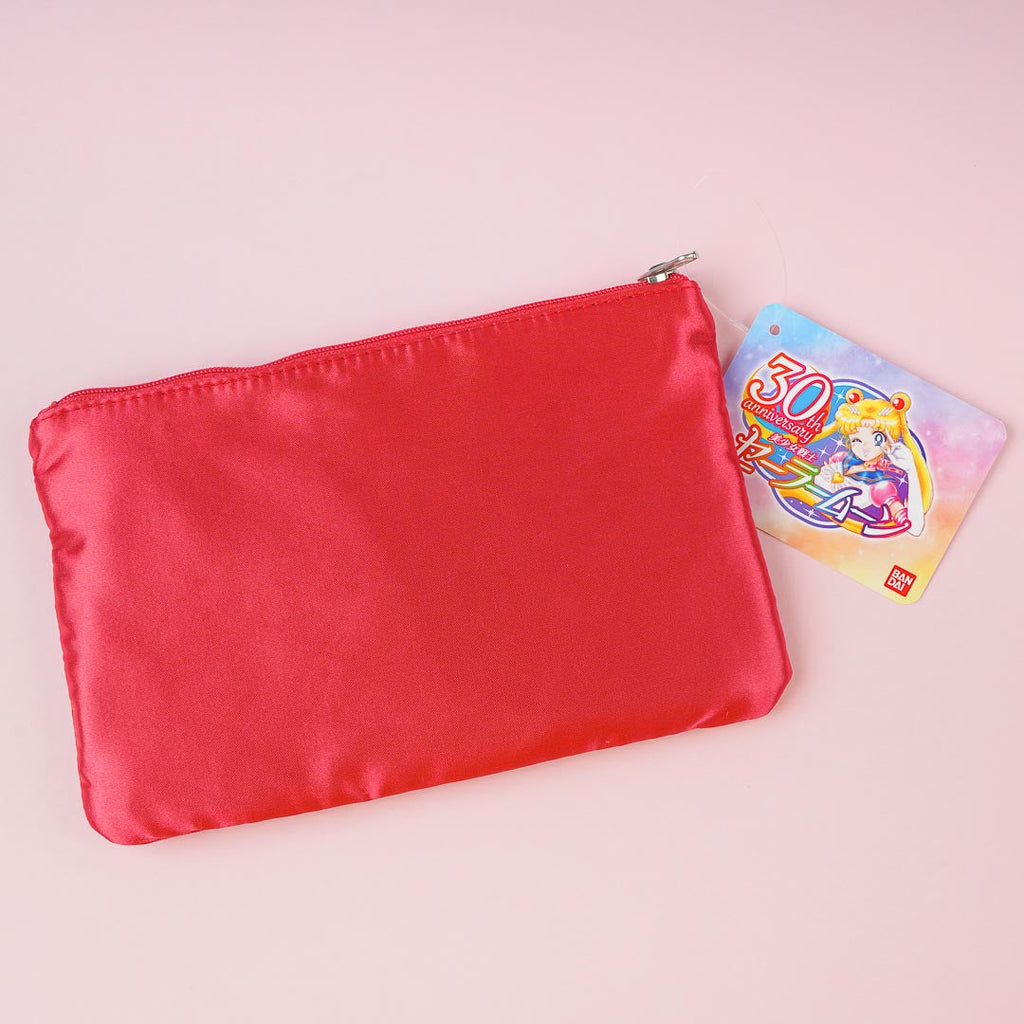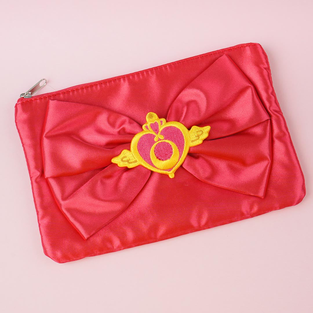 Store your small essentials in this kawaii flat pouch! It features the iconic Sailor Moon ribbon with an embroidered Crisis Moon Compact emblem. The pouch also comes with an inner lining with prints of cute accessories.