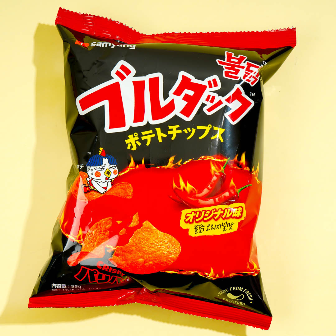 Buldak is a  Korean spicy chicken dish that's served as street food or a light meal. Enjoy the taste of buldak by snacking on this pack of potato chips! Each piece has the spicy and meaty flavor of buldak!
