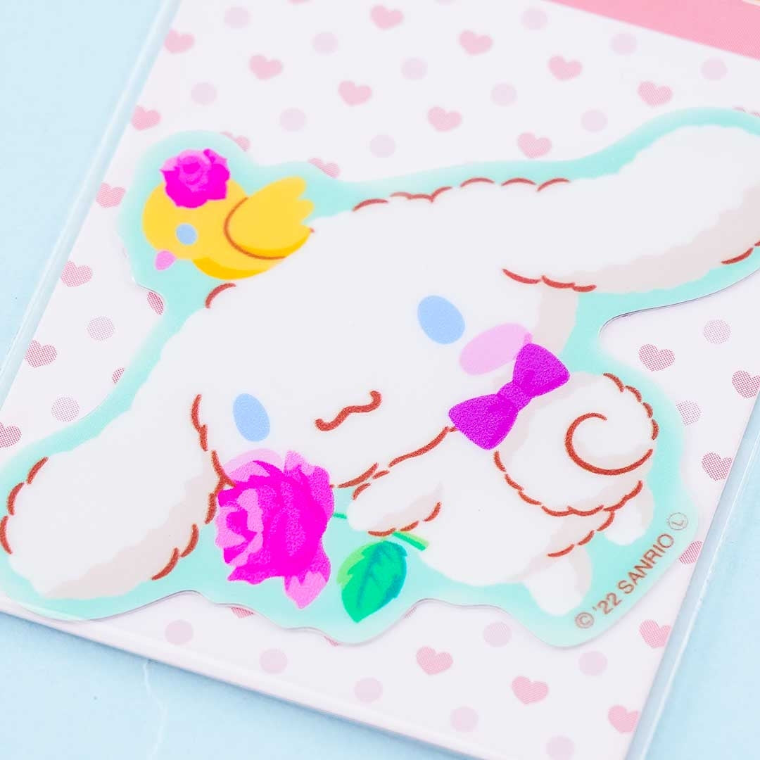 A die-cut and easy-to-peel sticker illustrated with prints of Cinnamoroll, flowers, and a cutie bird