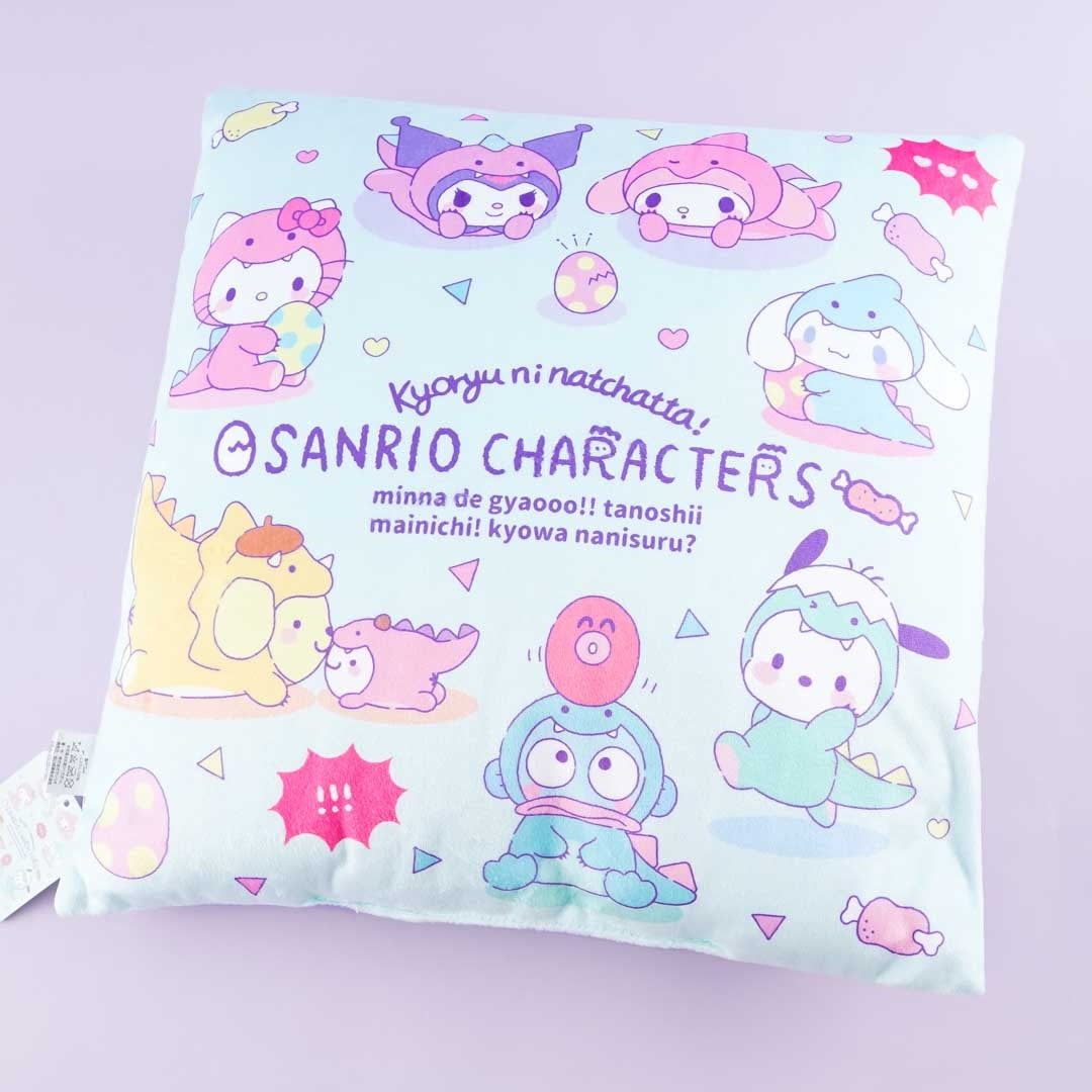 A cute cushion with a print on the sides showcasing Sanrio characters in dino onesies