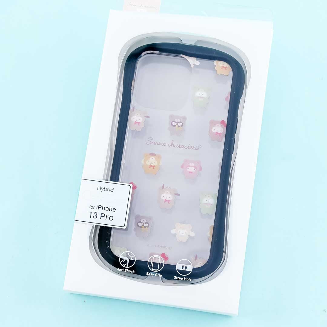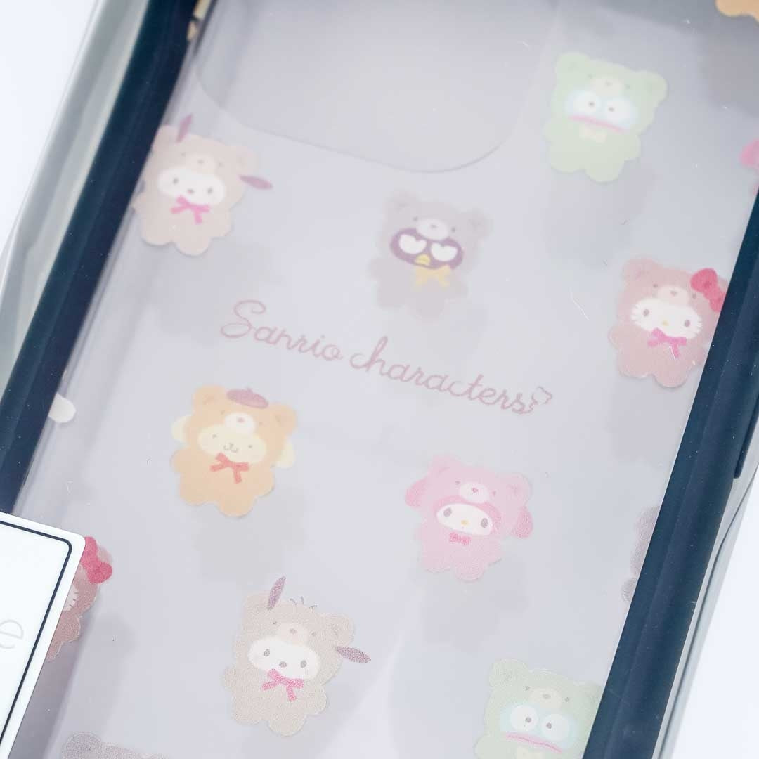A super cute clear phone case for the iPhone 13 Pro featuring prints of Sanrio characters dressed as bears
