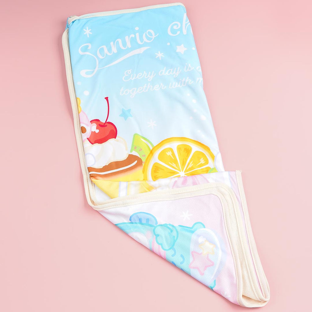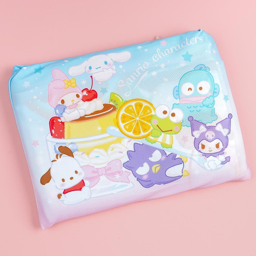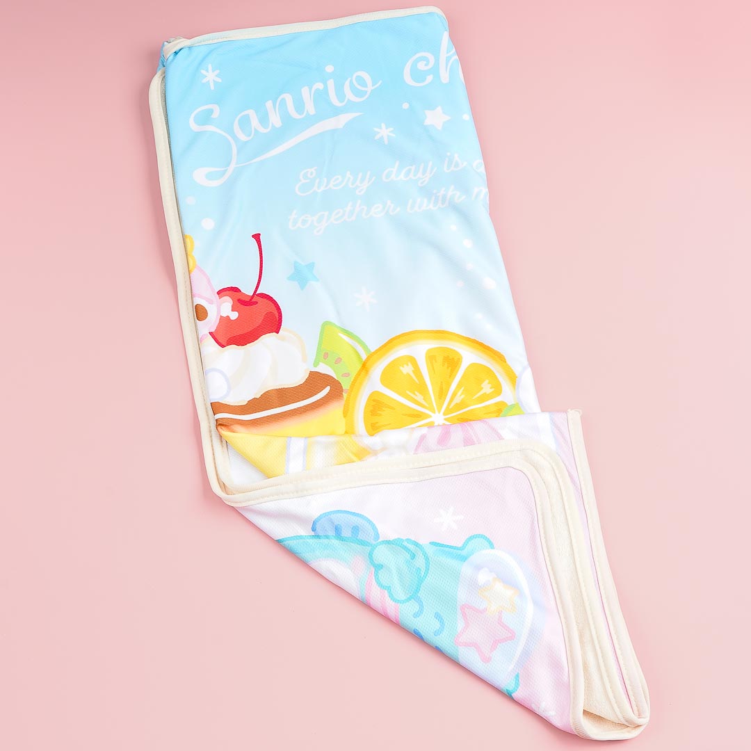 Use this kawaii breathable blanket during your next sleepover! It's illustrated with the Sanrio cuties and a large pudding. You can also fold the blanket into its pocket for storage.