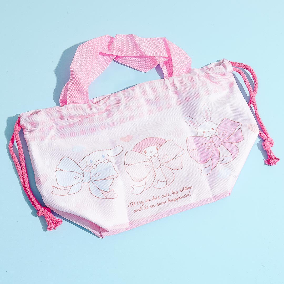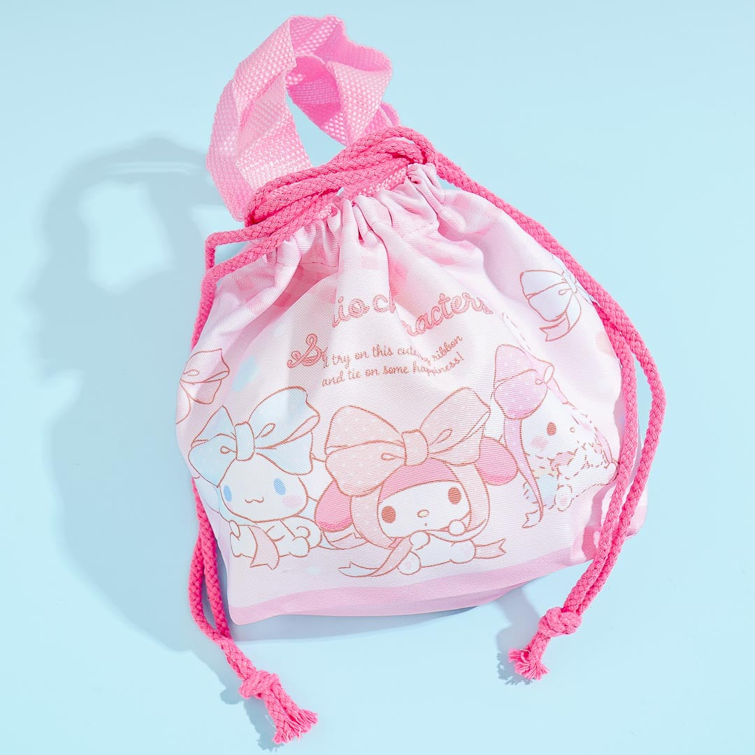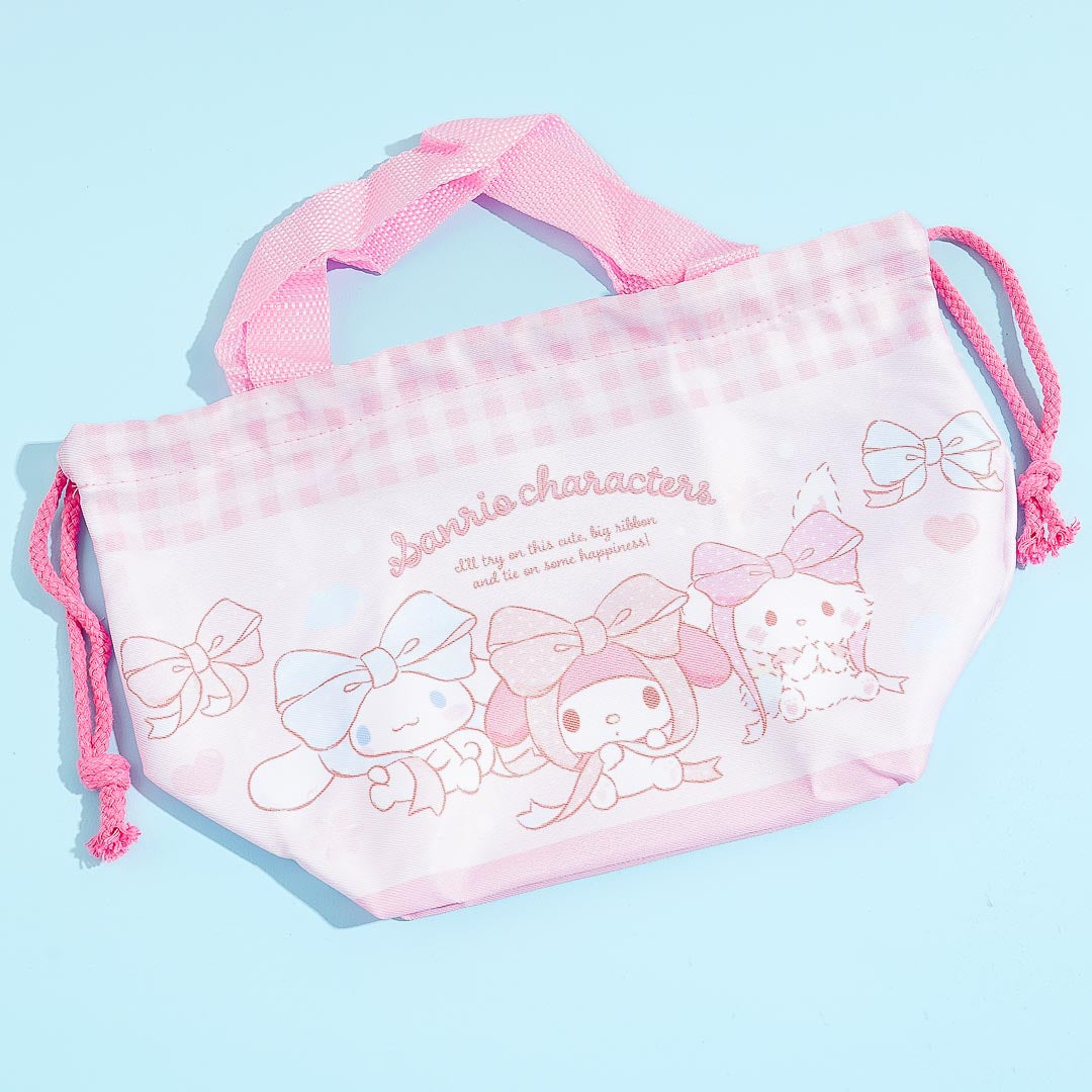 Bring your small essentials kawaii-style using this super cute handbag! It features cute illustrations of Sanrio Characters wearing big ribbons on their heads. This bag has a drawstring closure and a gusset-style bottom so you can easily put your things inside!