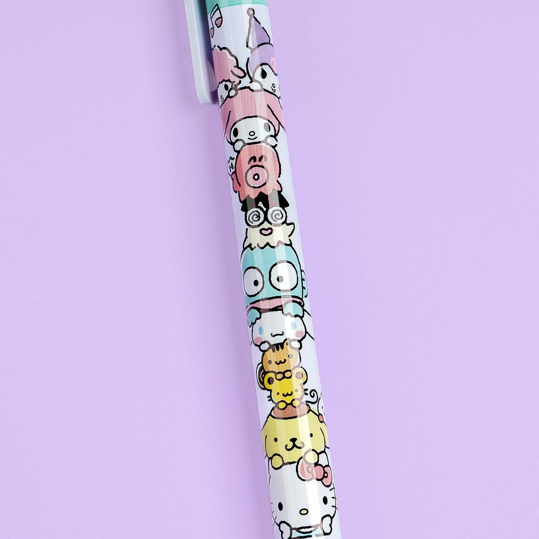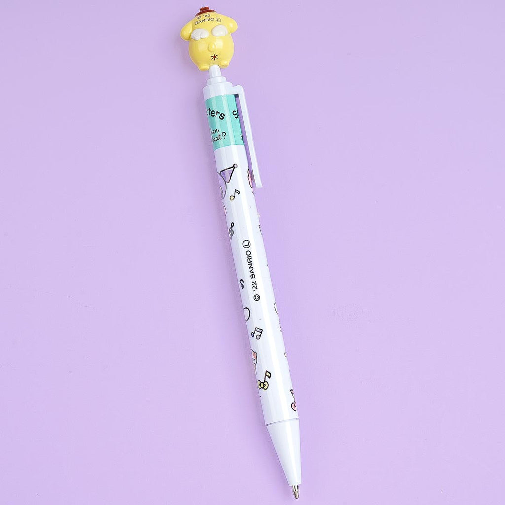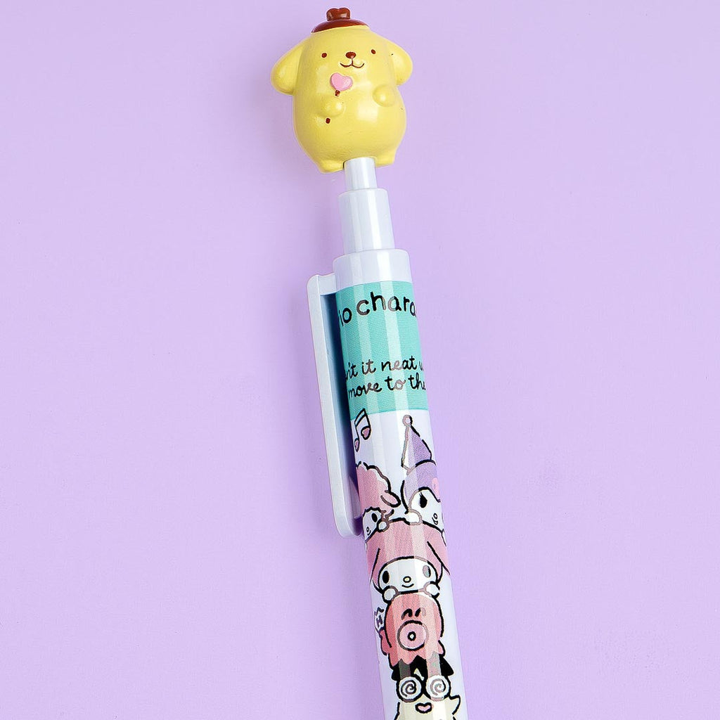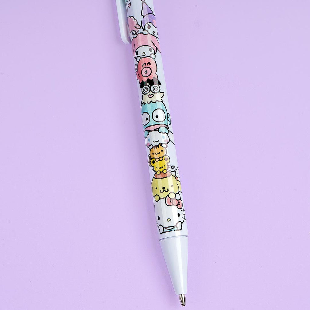 Write letters to your friends using this kawaii click pen! It showcases cute illustrations of Sanrio Characters stacked up. This ballpoint pen also comes with a kawaii Pompompurin charm on top.