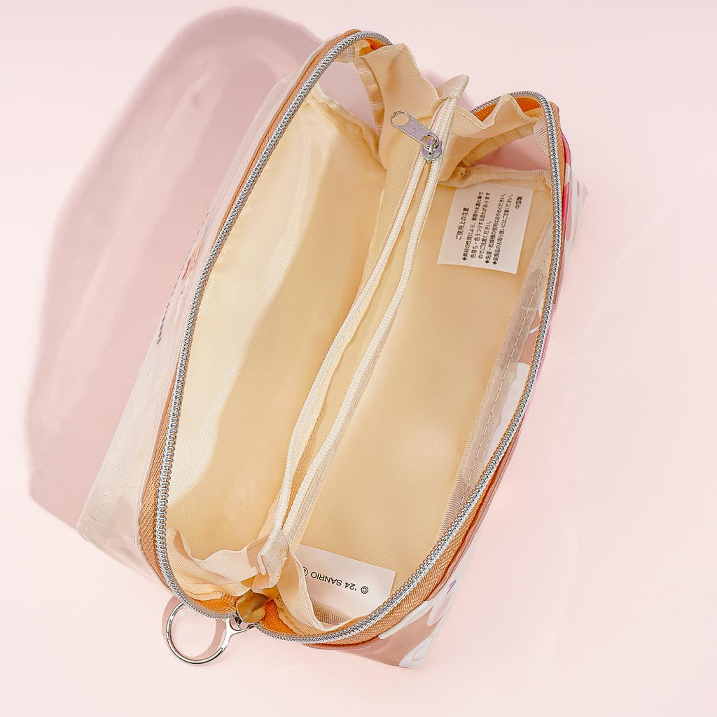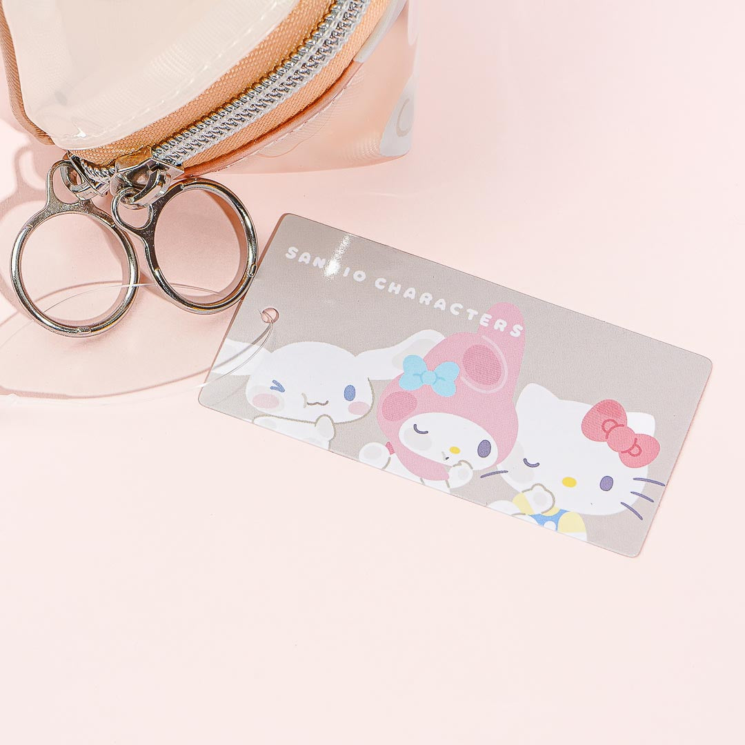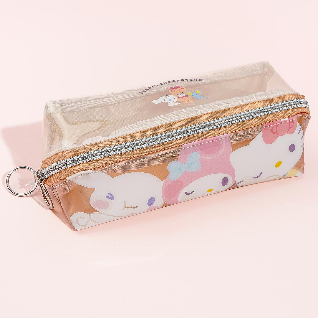 Keep your writing tools and other art materials inside this box-type mesh case! It features a kawaii print of Sanrio Characters Cinnamoroll. My Melody, and Hello Kitty winking together.