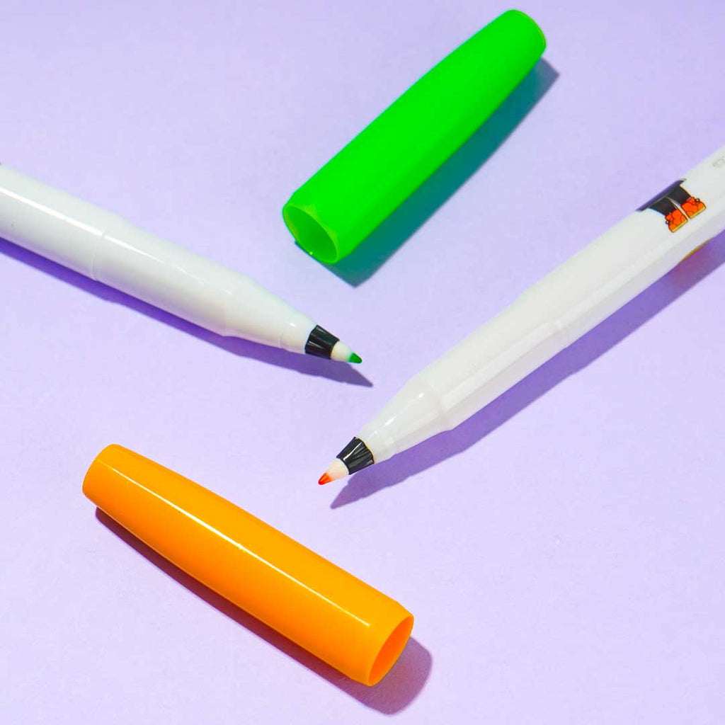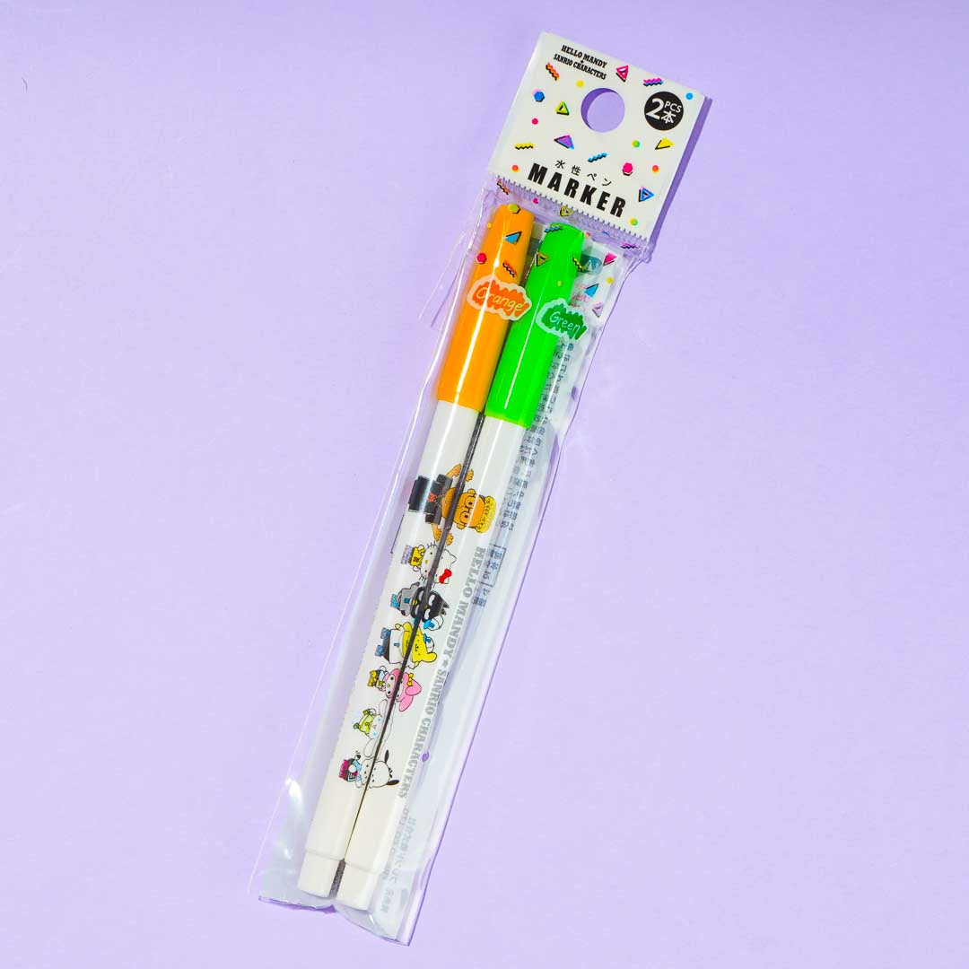 This marker set features a kawaii illustration of the Hello Mandy x Sanrio Characters series. It includes green and orange water-based ink markers that you can use for your calligraphy.