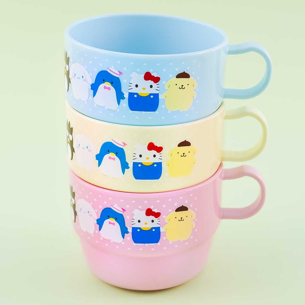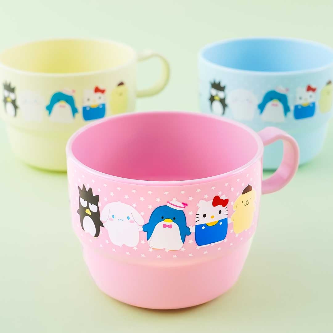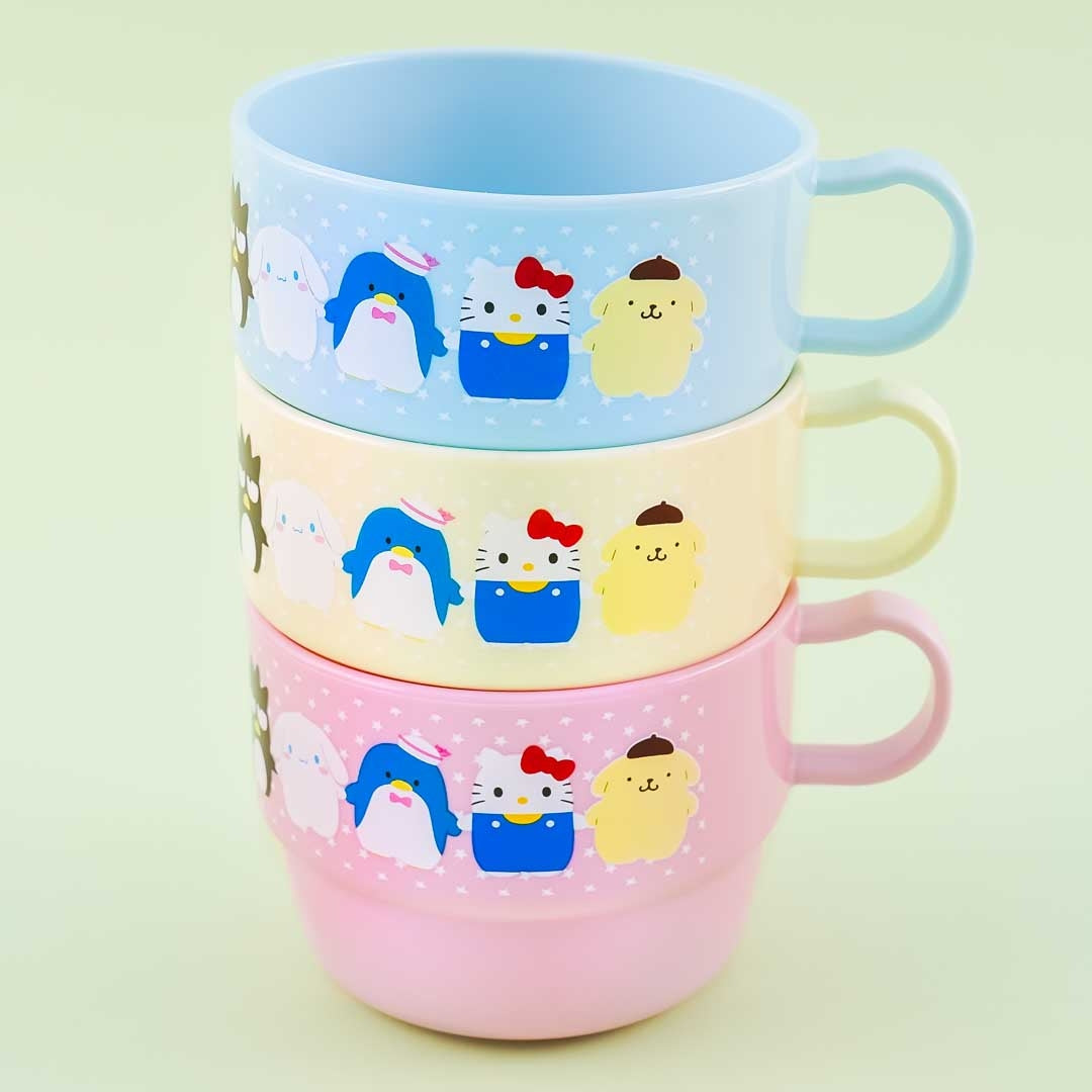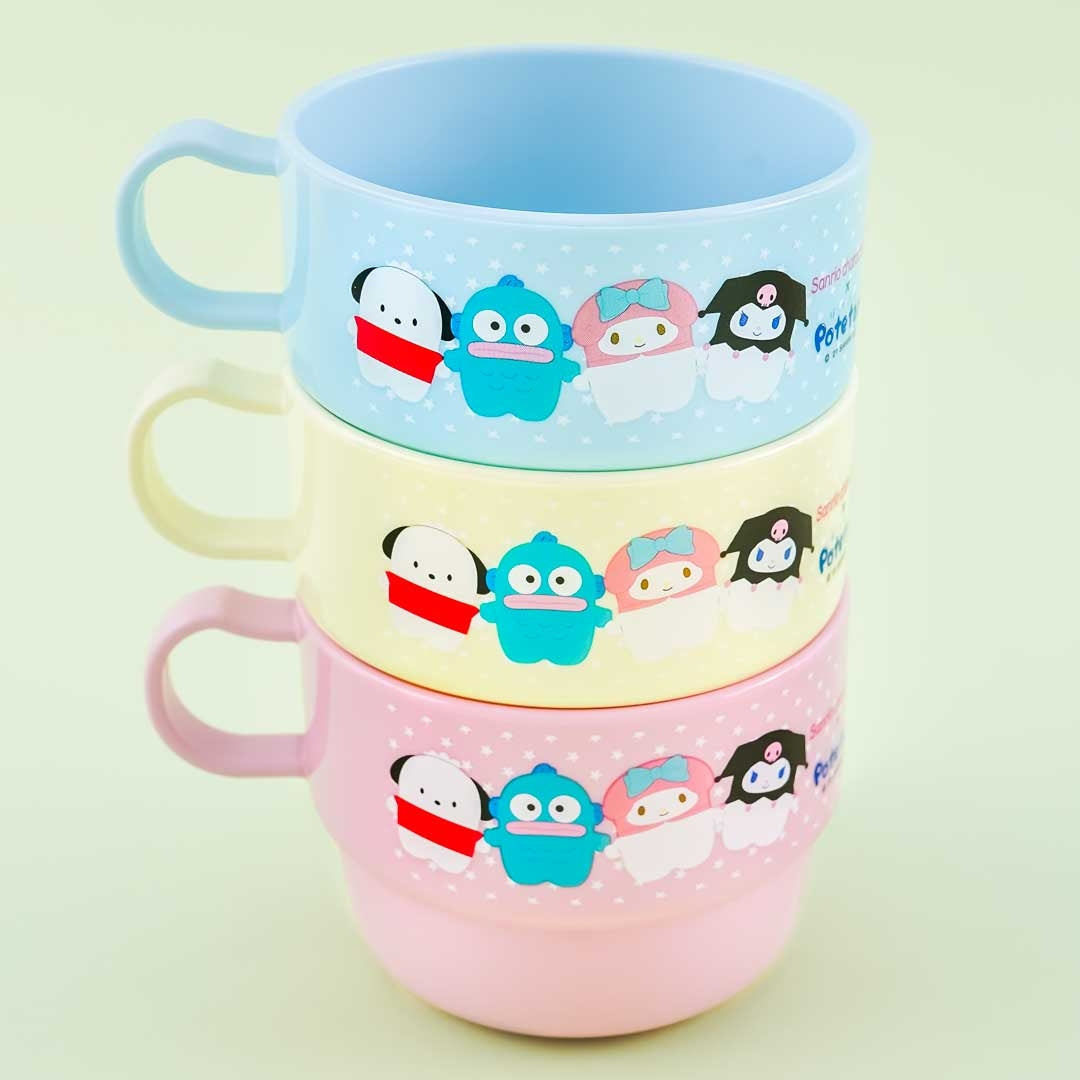 A kawaii set of mugs illustrated with Sanrio characters resembling Potetan animal plushies
