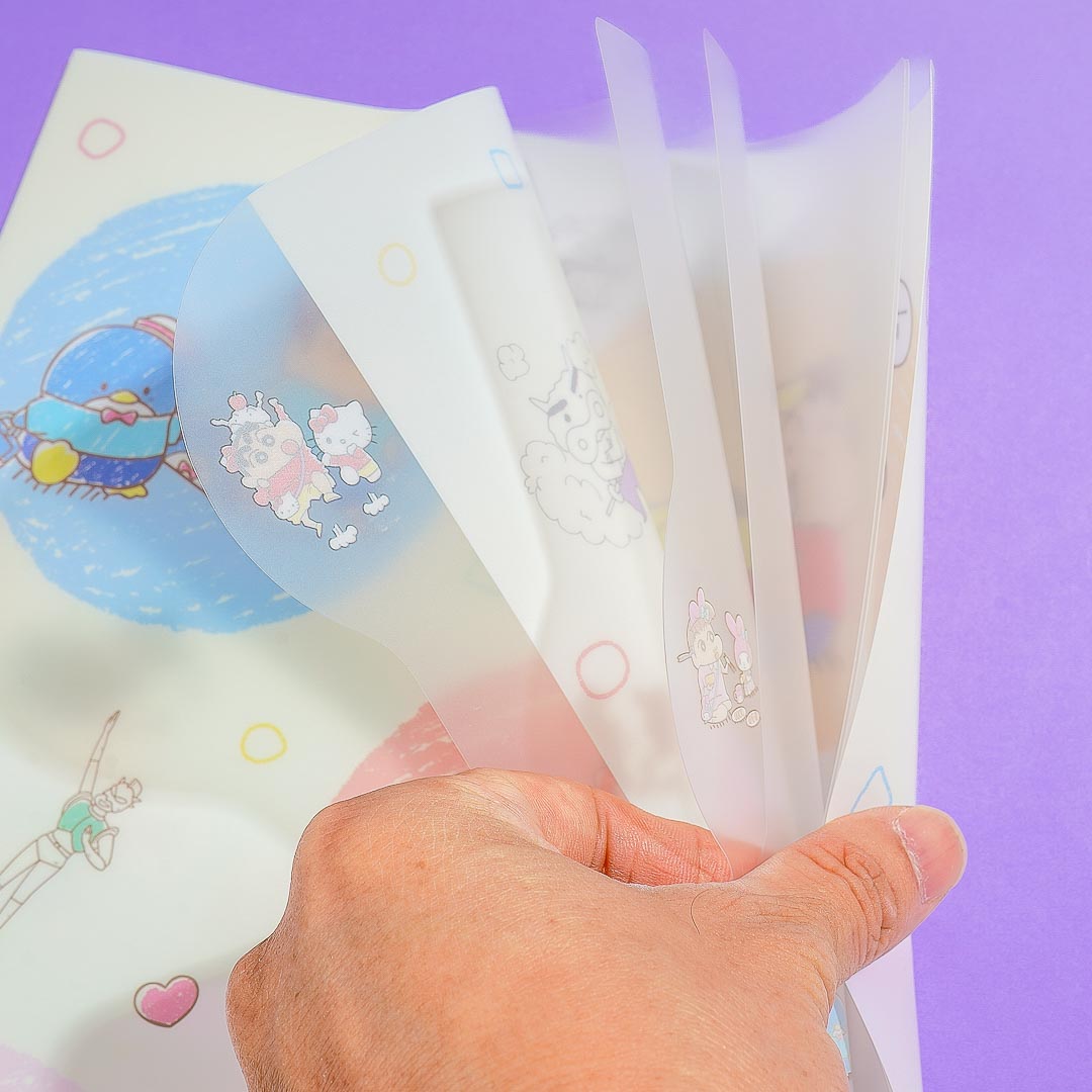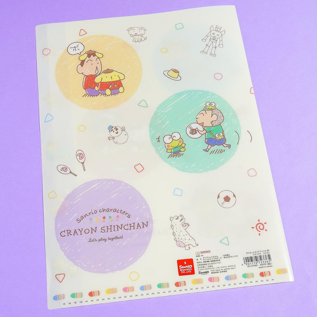 This kawaii clear file folder is illustrated with Crayon Shin-Chan characters playing with cuties from Sanrio. Use this plastic folder to organize documents you need to use for work or for school! It has five different partitions so you can arrange your papers easily.