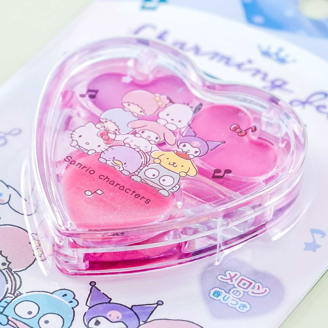 Have fun experimenting with your makeup by using this colorful melon-scented palette! It has a lip color and two vibrant eyeshadows, and a mini eyeshadow applicator! This super cute makeup set comes in a transparent plastic case shaped like a heart that has kawaii prints of popular Sanrio characters like Pochacco, the Little Twin Stars, Hello Kitty, and more! The makeup palette is safe for almost all skin types and children can use this palette as well.