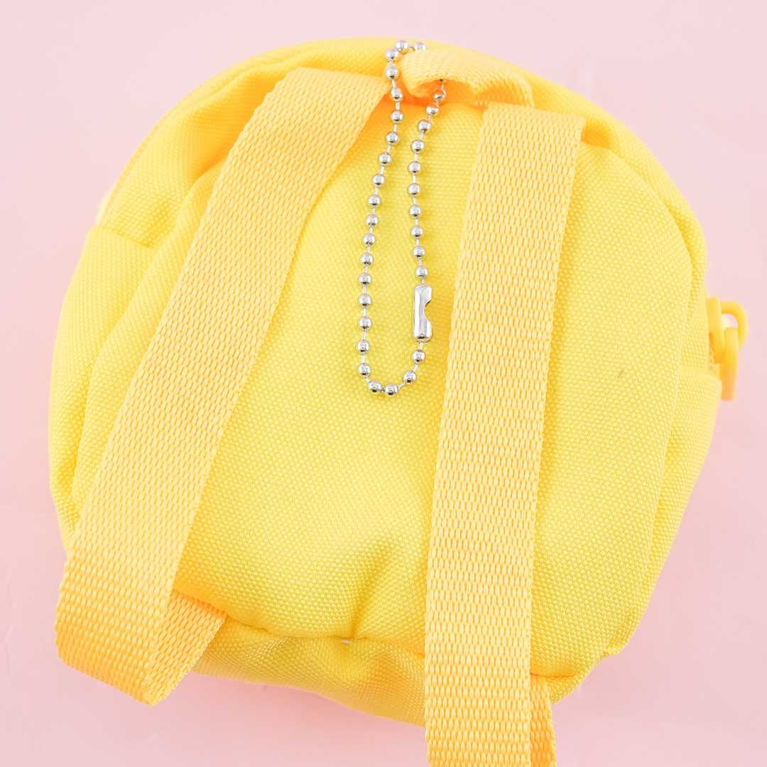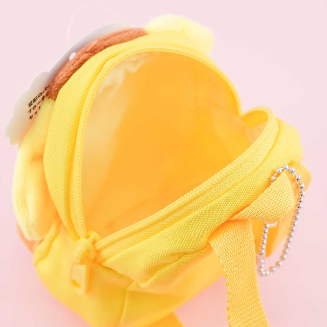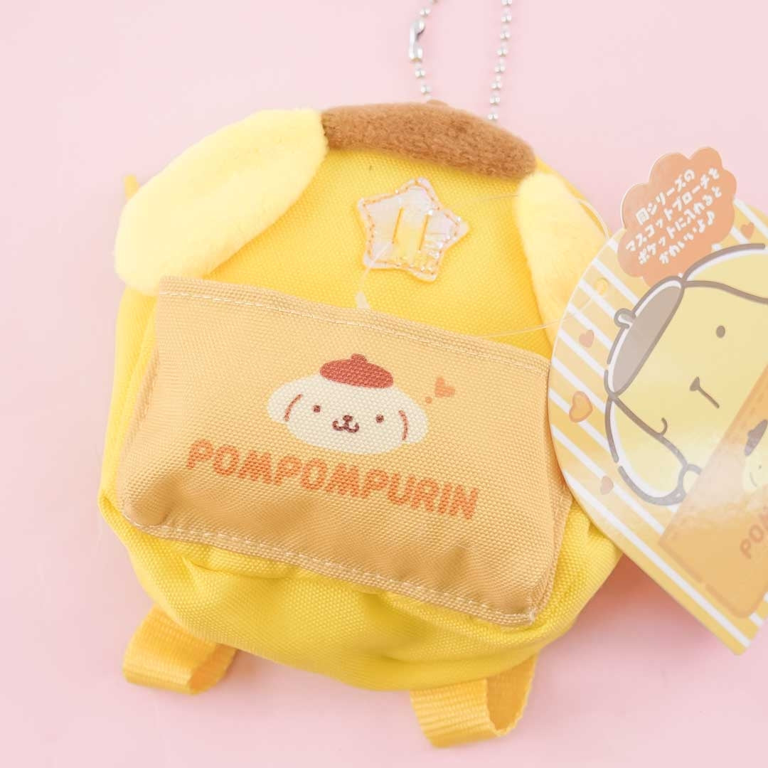 A super kawaii zippered pouch that resembles a mini backpack featuring Pompompurin that doubles as a charm