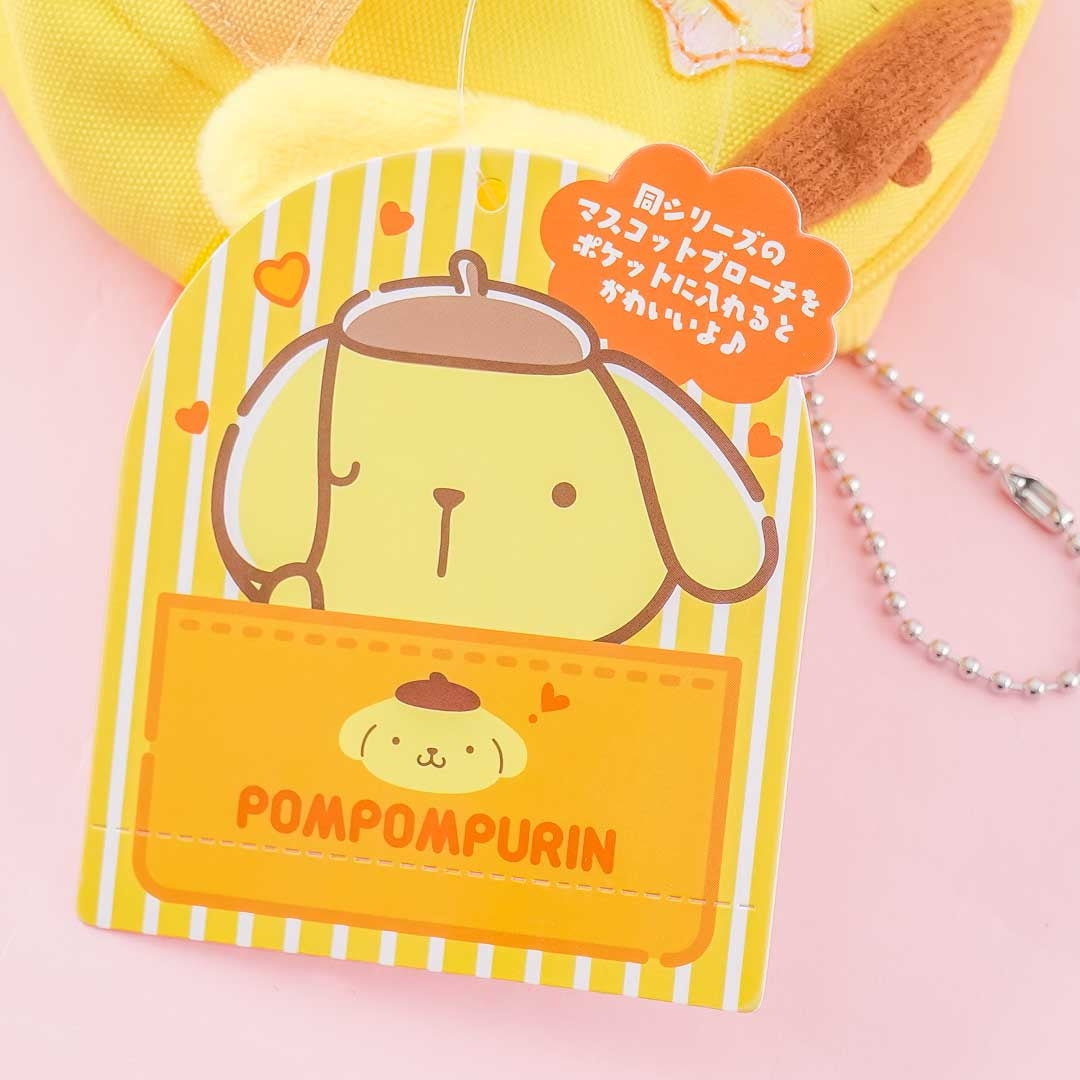 This super cute zippered pouch looks like a miniature backpack with pop-out dog ears! Store your train card, ID, and other small essentials inside to keep them from getting lost. The pouch also features a deep front pocket with an illustration of Pompompurin where you can place any plushie badge from the same series. It also comes with a removable ball chain.