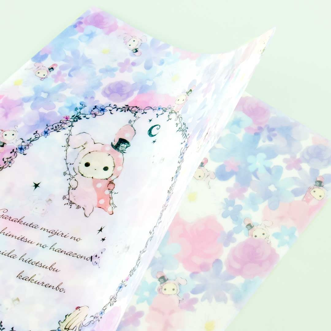 Organize your essential documents with this super kawaii L-shaped A4 index folder. This semi-transparent folder features Shappo of Sentimental Circus with blooming flowers!