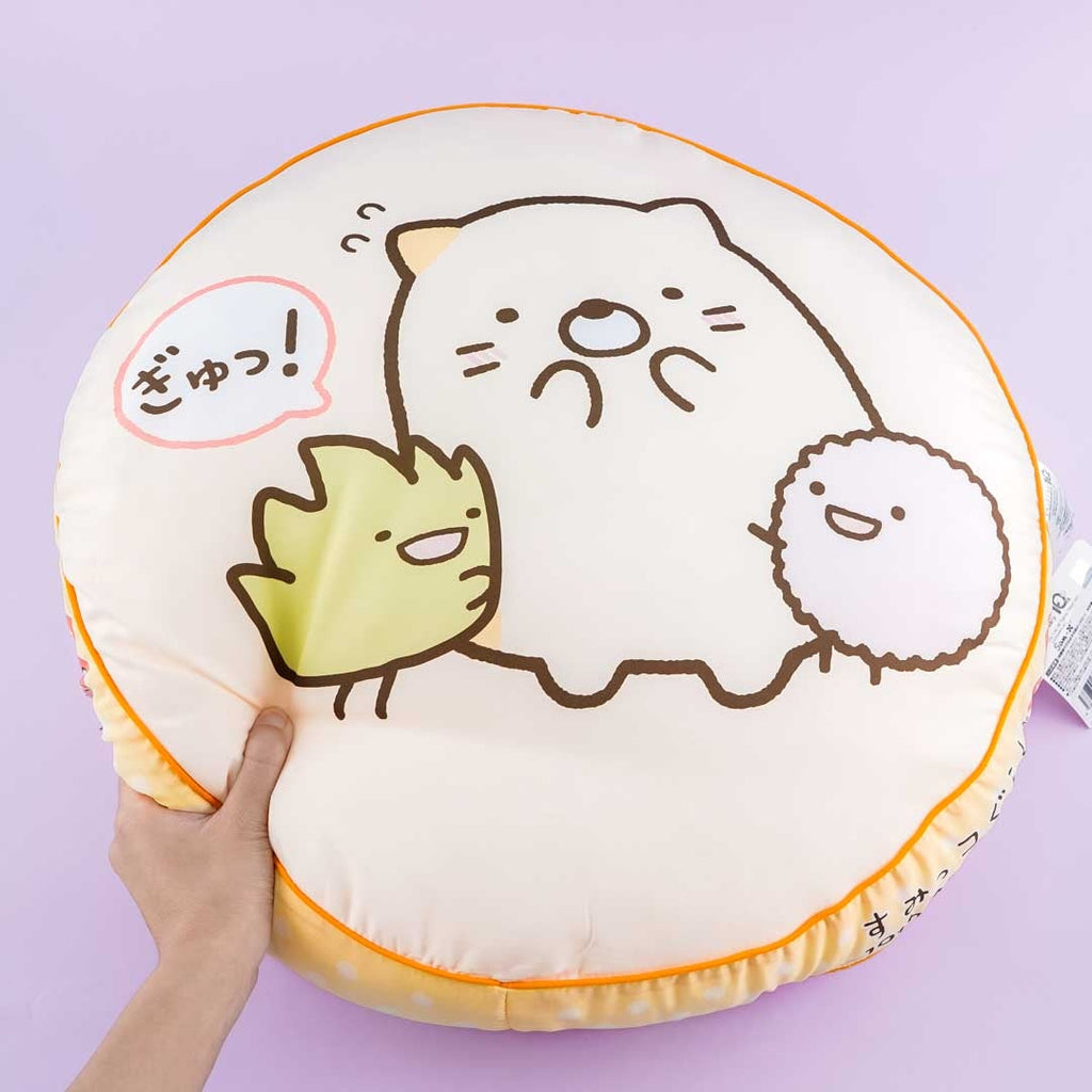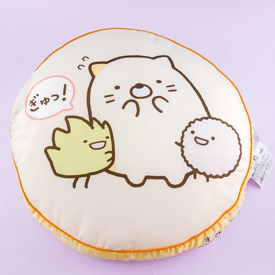 • A kawaii round pillow with prints of Neko and friends from Sumikko Gurashi
