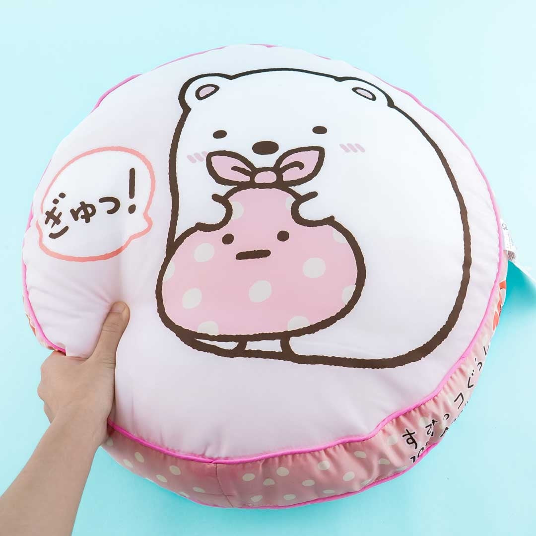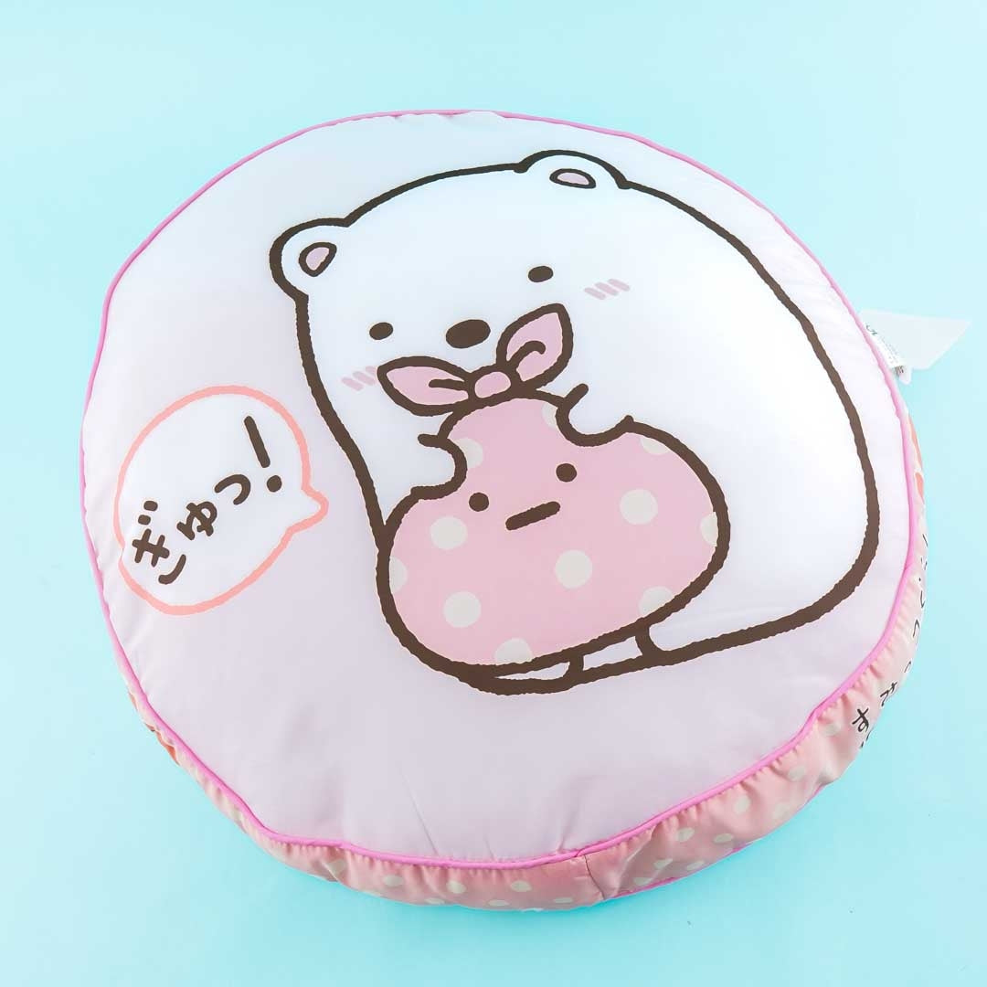• A kawaii round pillow with prints of Shirokuma and friends from Sumikko Gurashi