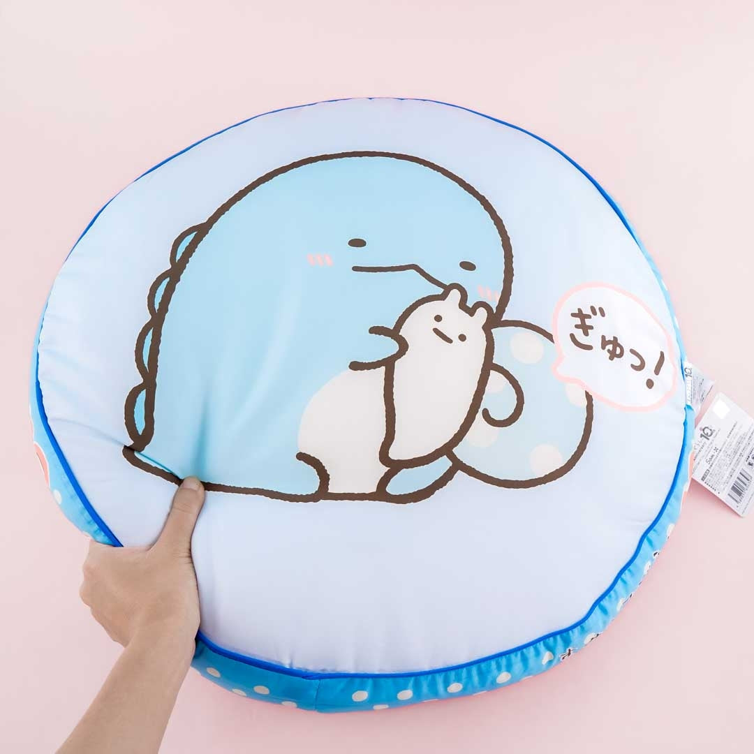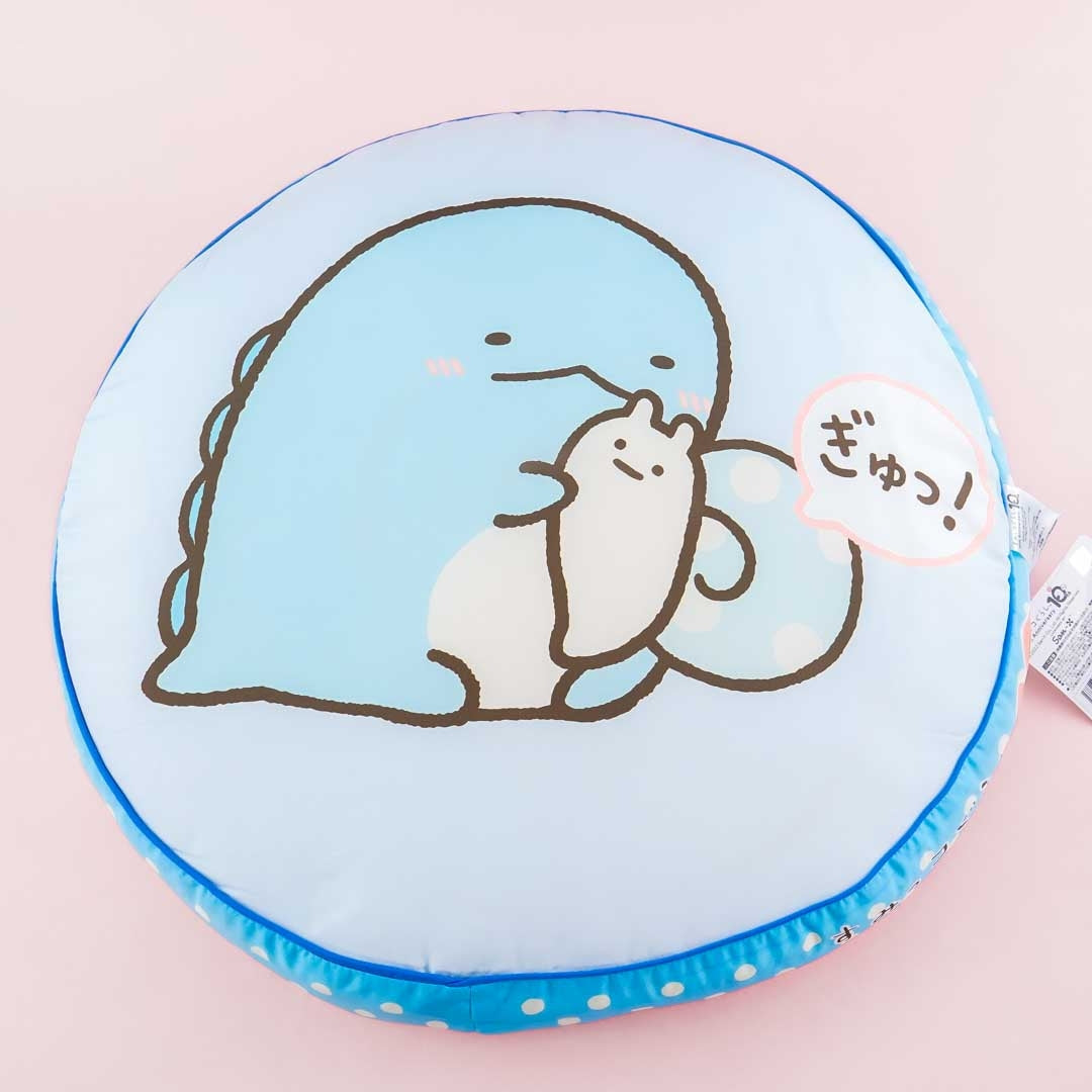 A round pillow with cute prints of Tokage and friends from Sumikko Gurashi