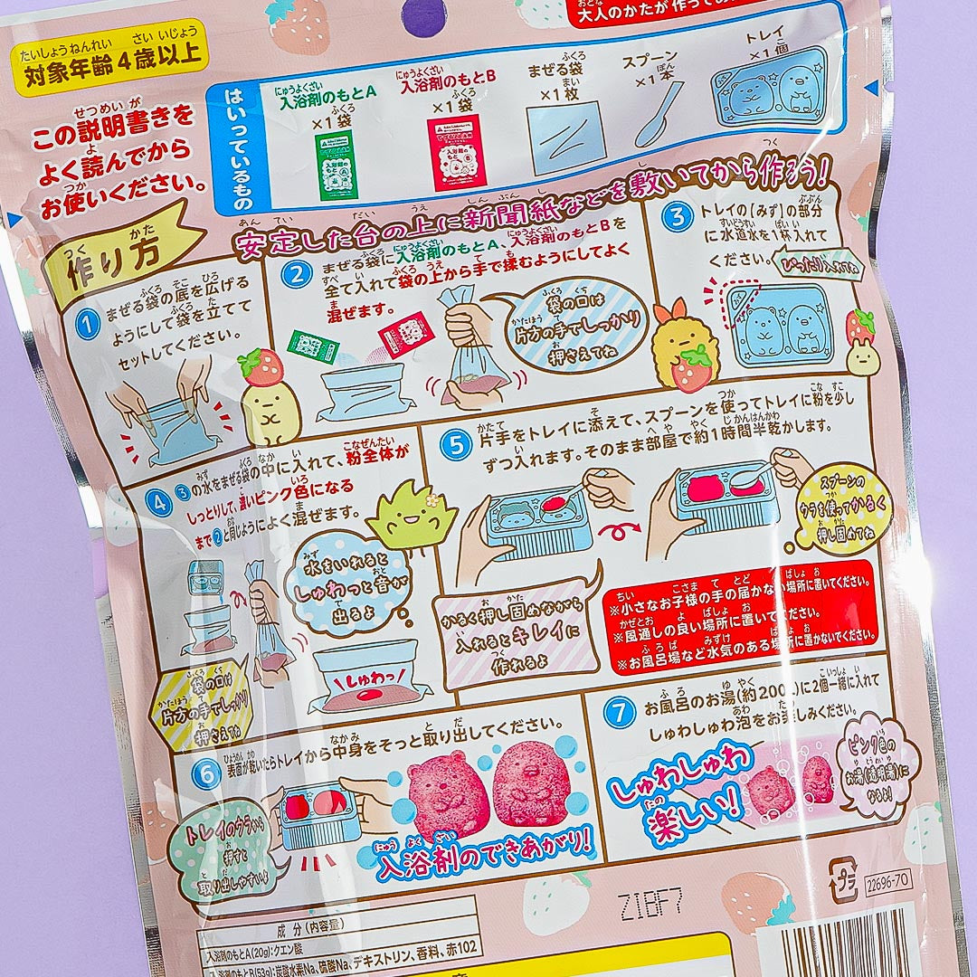 Enjoy making your own bath bomb with this Sumikko Gurashi DIY kit! Mix, mash, and harden the ingredients to make Shirokuma and Penguin?-shaped bath bombs for your bath time. Drop them in the tub to make the water fizzy and smell like strawberry!