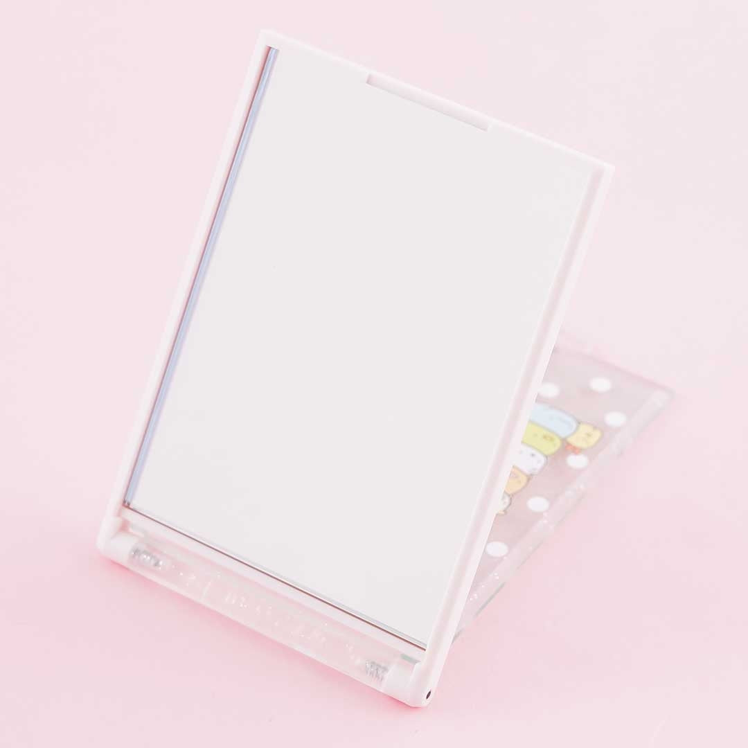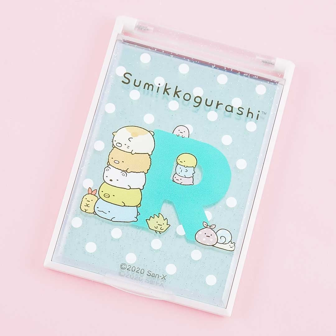 A kawaii folding mirror featuring prints of the Sumikko Gurashi with the letter R