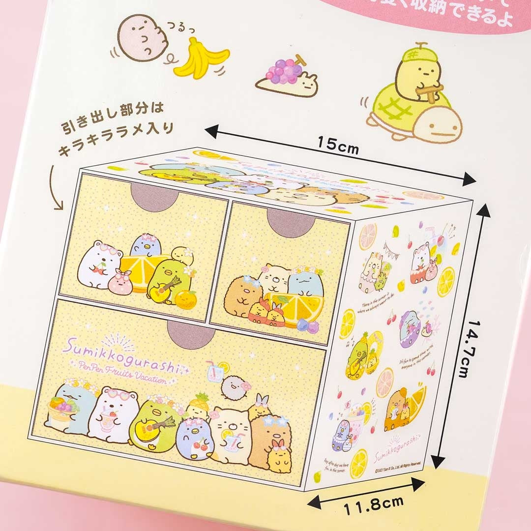 • A kawaii desktop organizer illustrated with the Sumikko Gurashi and fruits