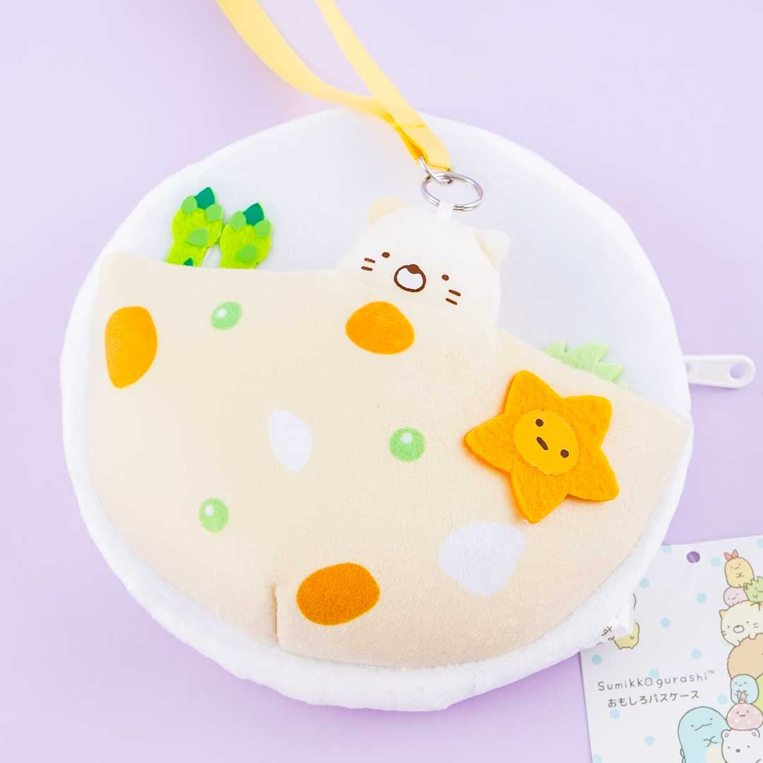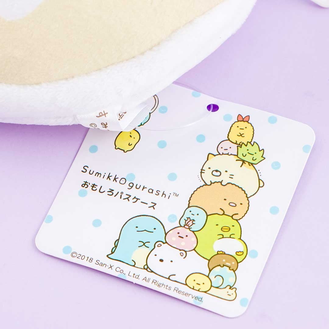 A cute zippered pass case with a Neko plushie decor from the Sumikko Gurashi