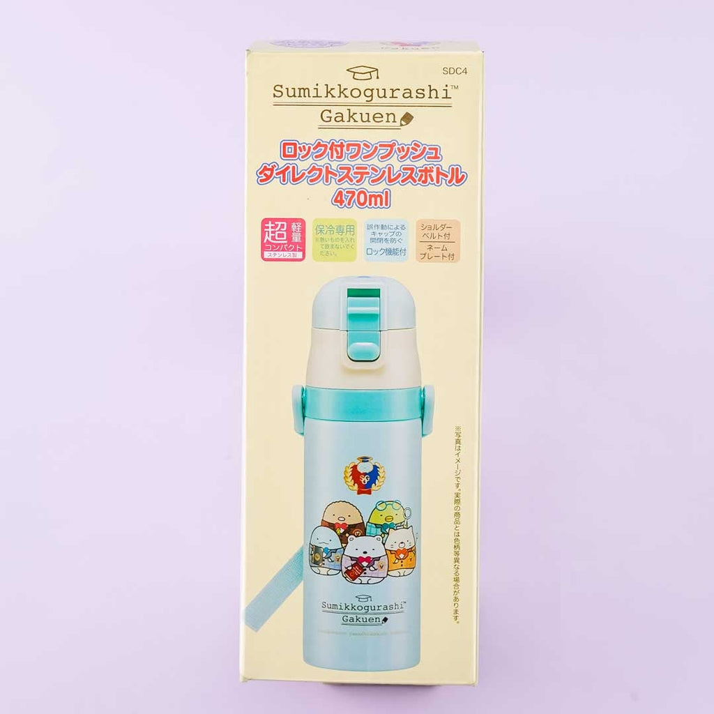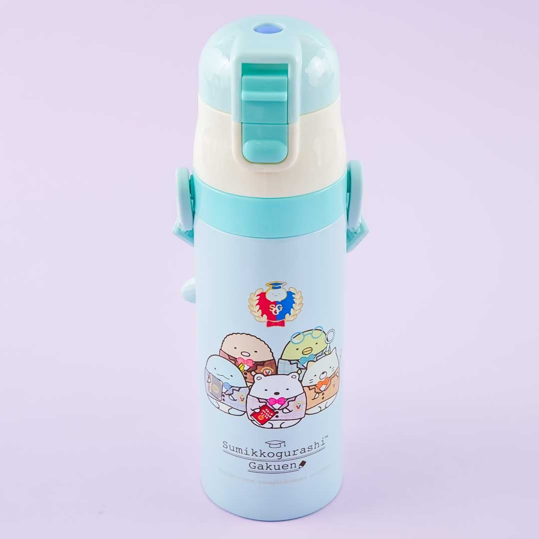 A kawaii water bottle featuring prints of the Sumikko Gurashi dressed up for school