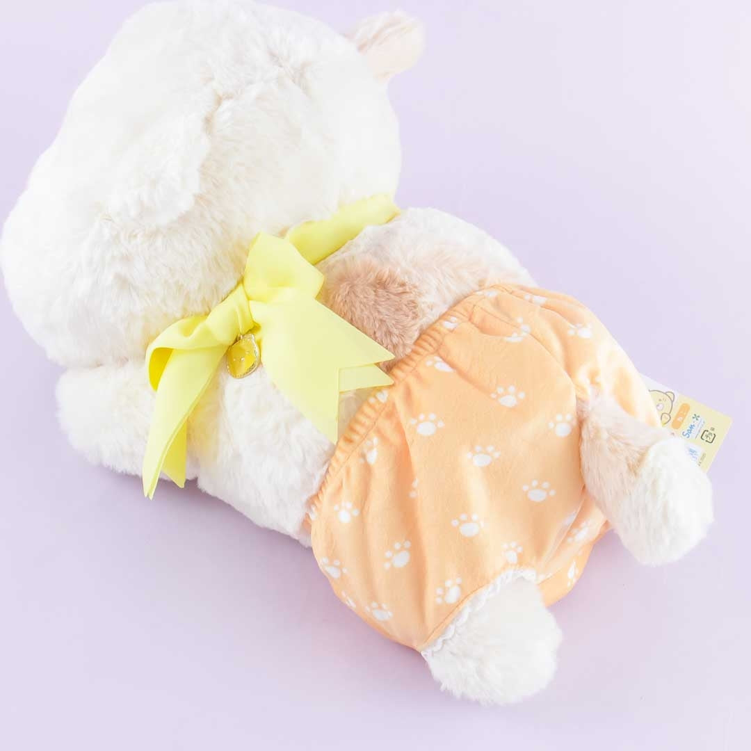 A medium Neko hugging plushie from Sumikko Gurashi wearing a yellow ribbon and orange shorts