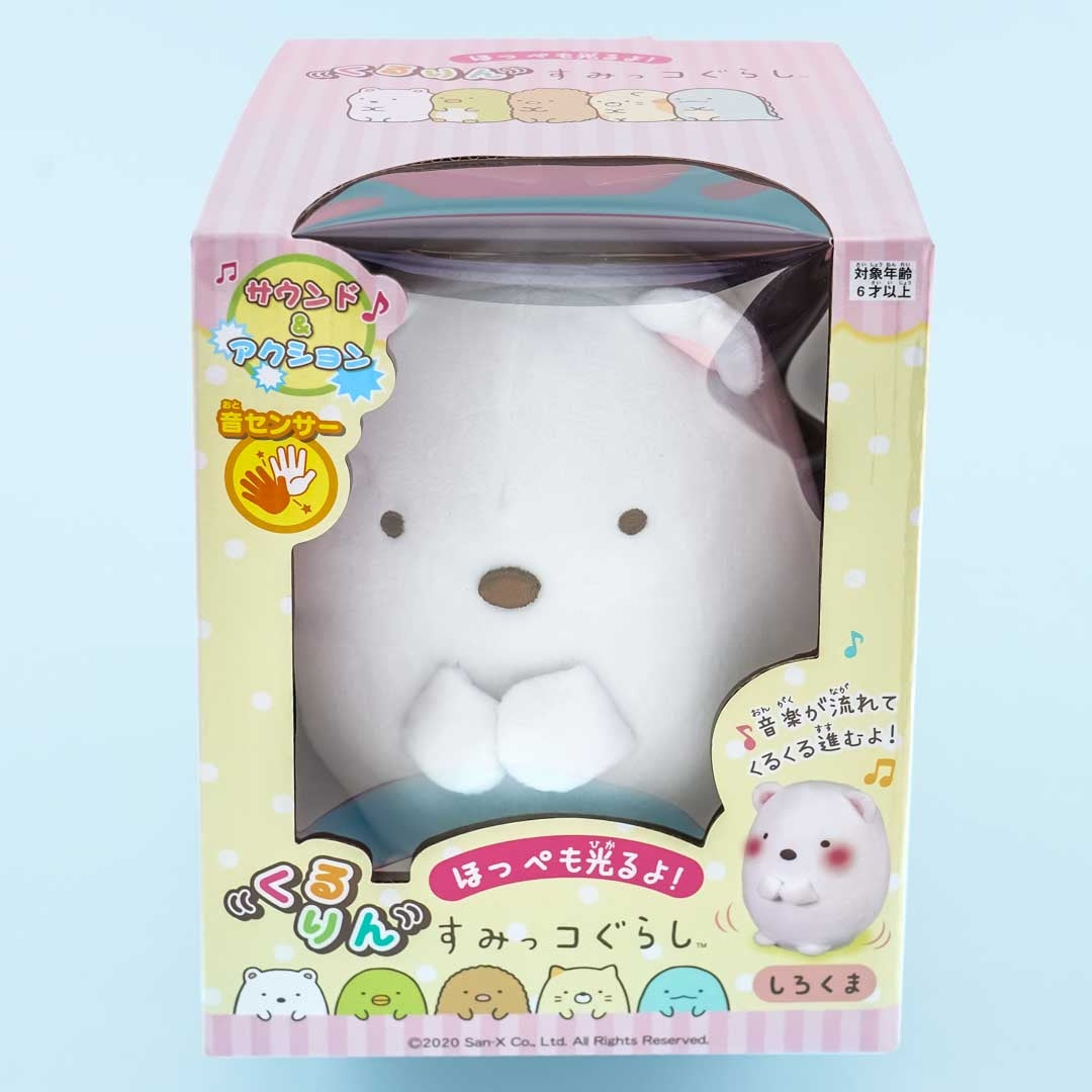 Have fun playing together with Shirokuma from the Sumikko Gurashi gang! This medium-sized plushie toy has cheeks that shine to the music of the Sumikko Gurashi. It also rotates and moves around happily!