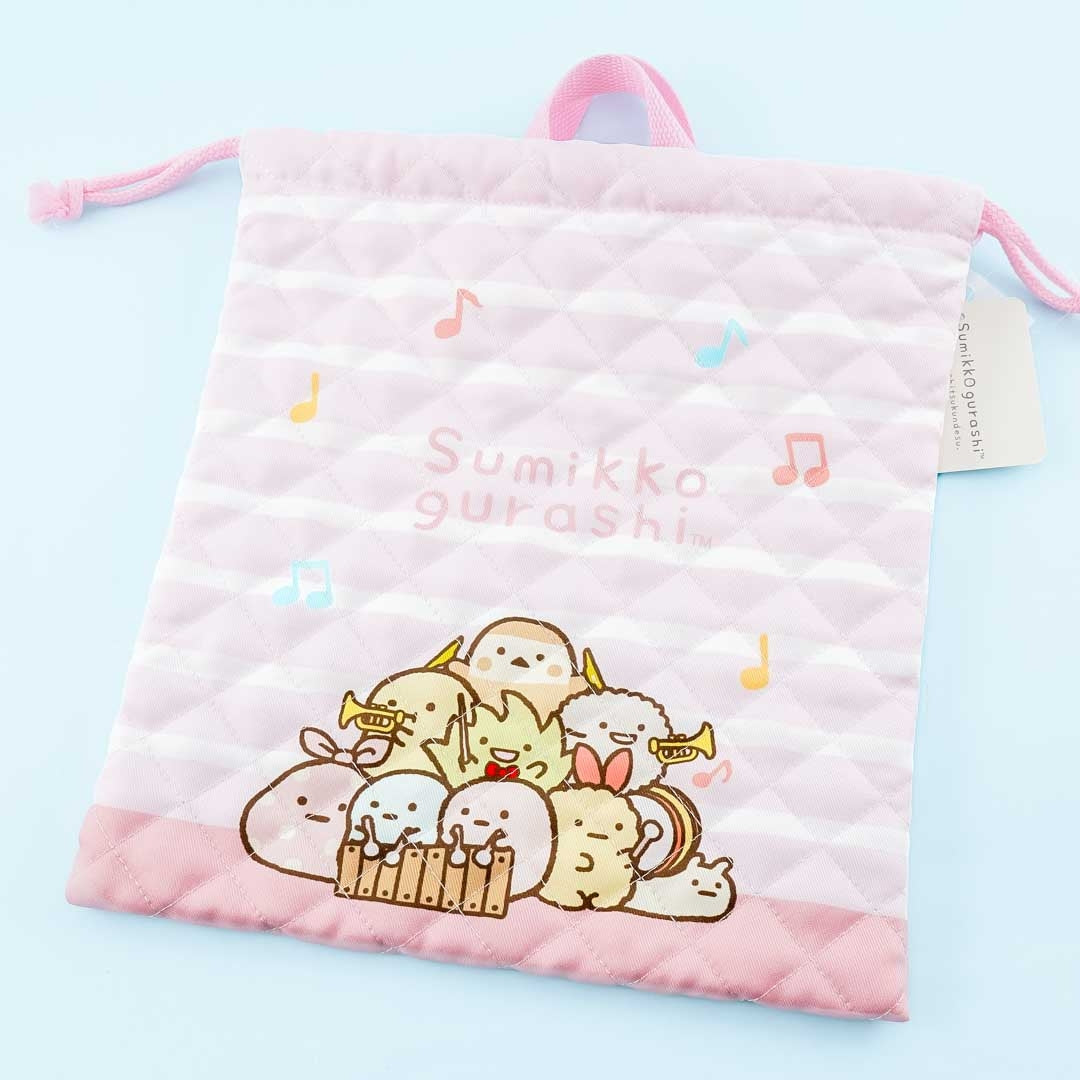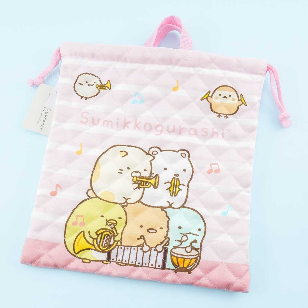 A super cute drawstring handbag featuring the characters from Sumikko Gurashi playing music instruments