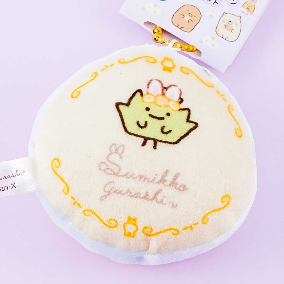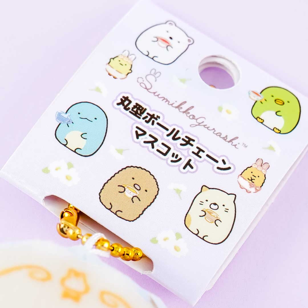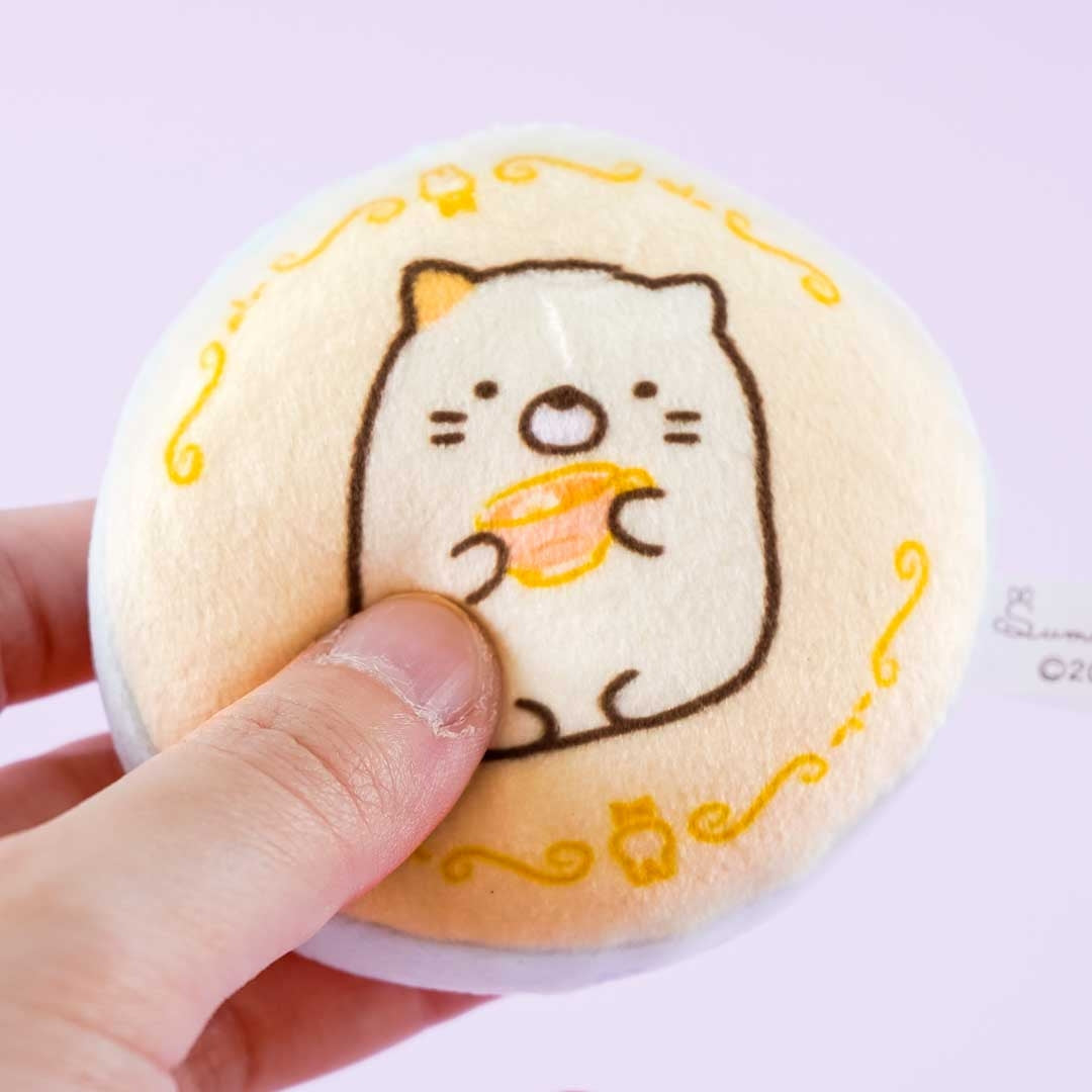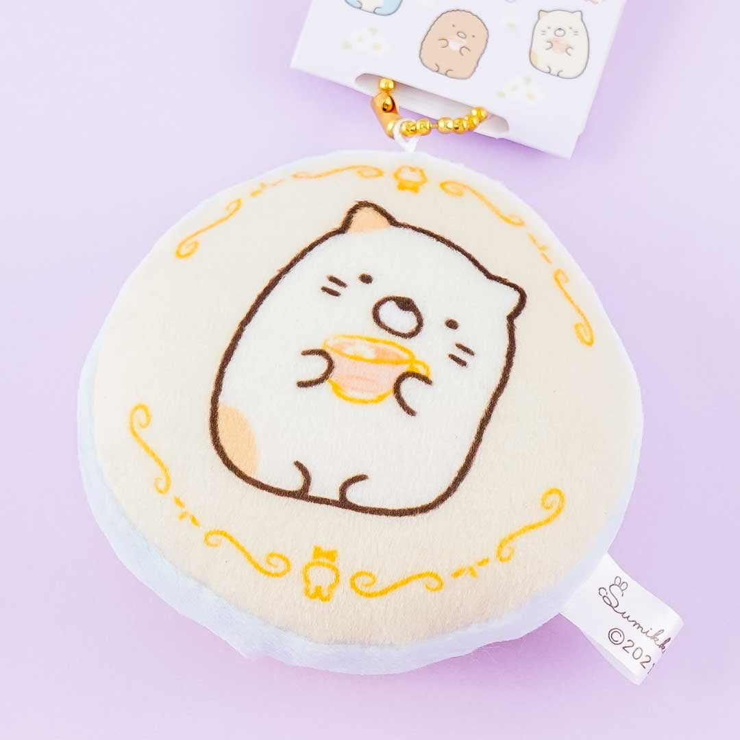 Take along this round plushie charm with you on your next adventure. It's decorated with a print of Neko from the Sumikko Gurashi drinking tea! You can attach it to your favorite bag with its removable ball chain.