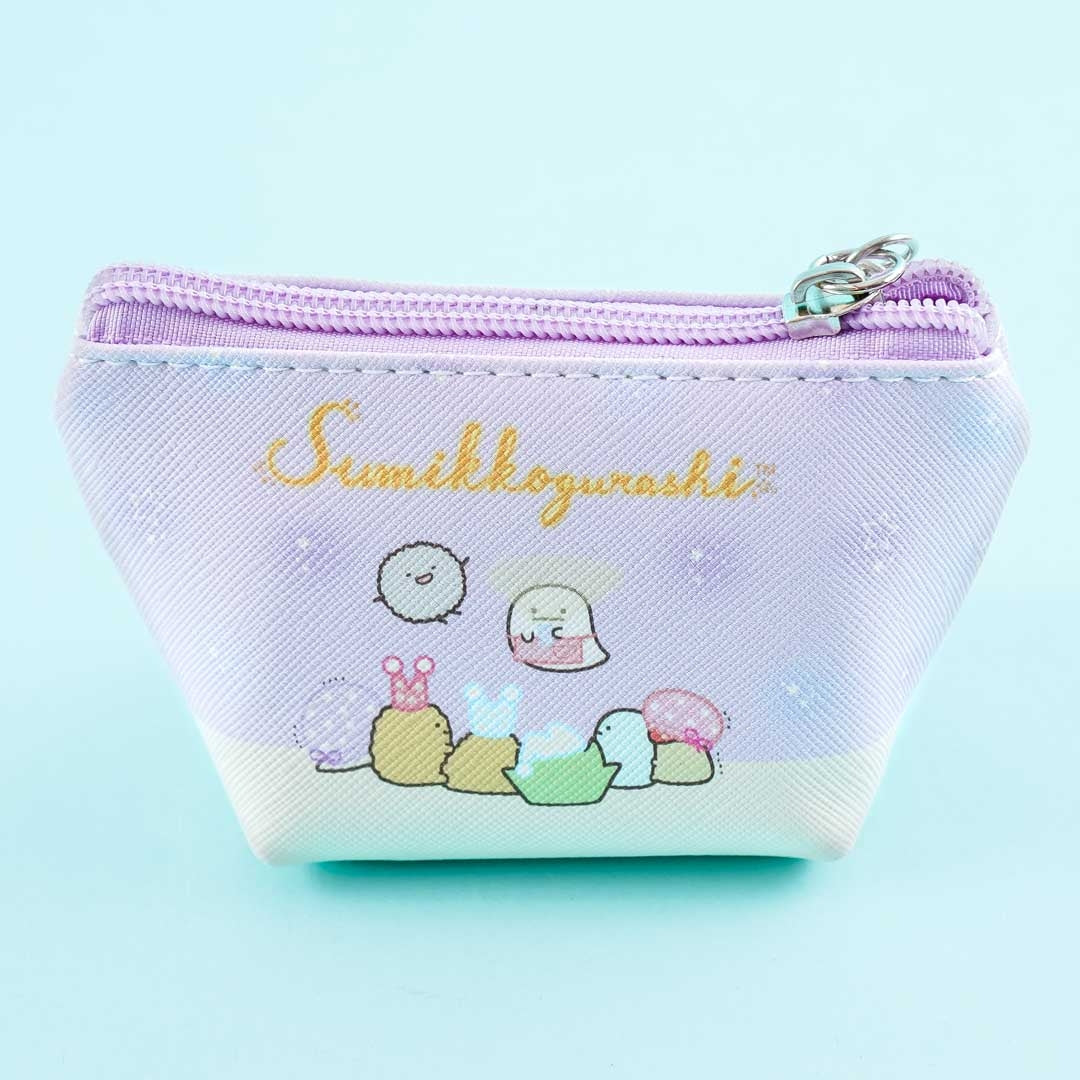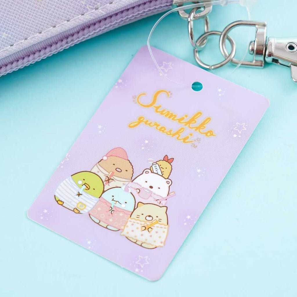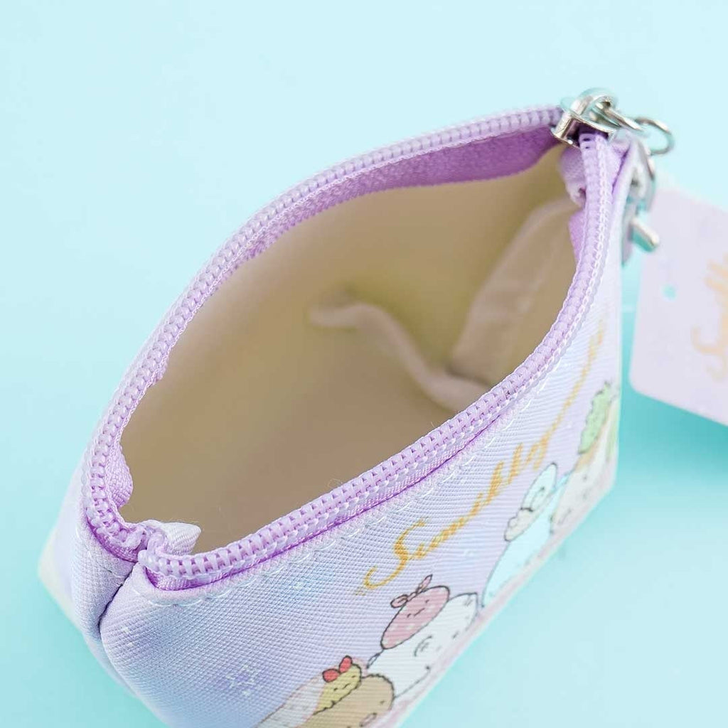 A small-sized pouch with a cute illustration of the Sumikko Gurashi gang having a slumber party