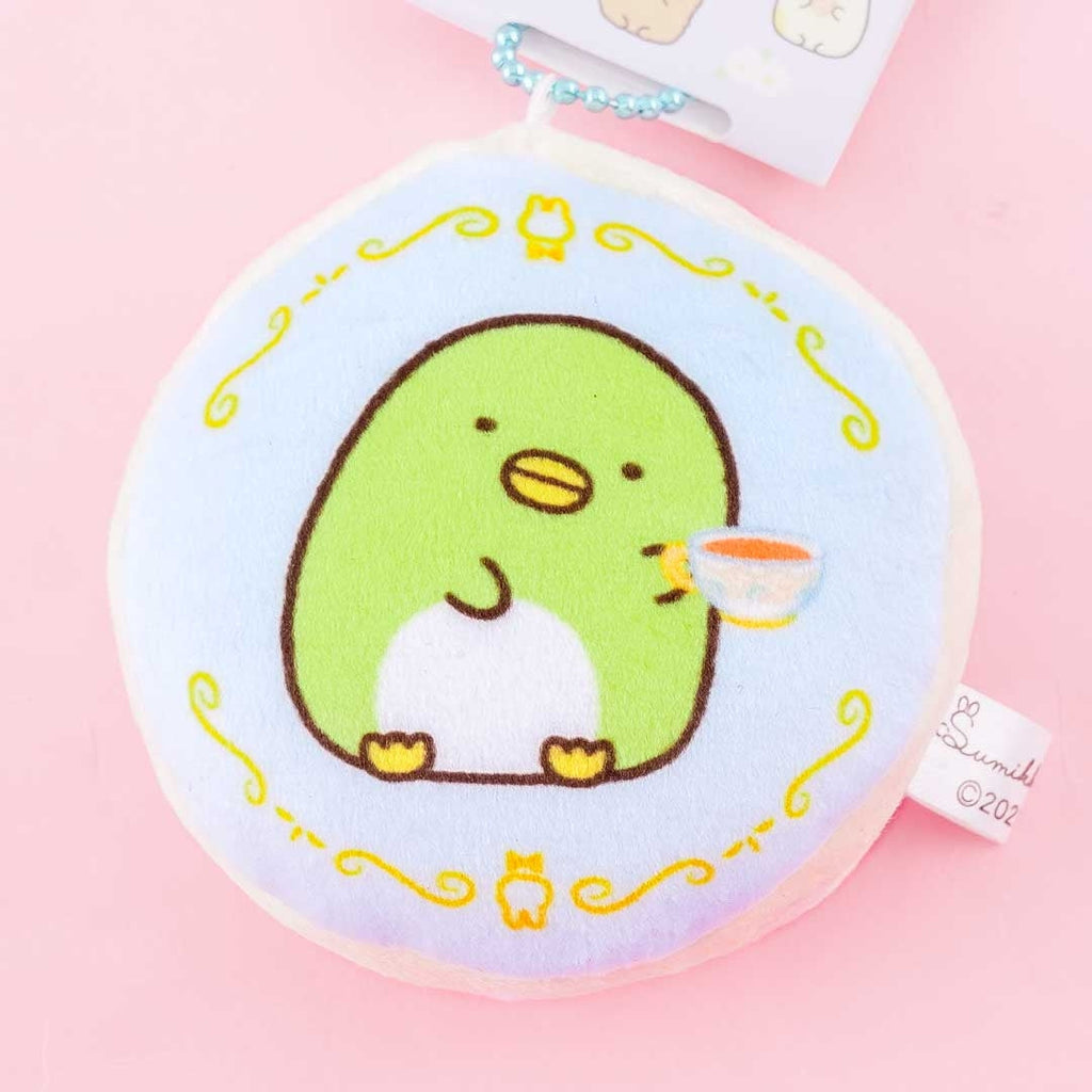 A cute round plushie charm featuring a print of Penguin? from the Sumikko Gurashi having tea