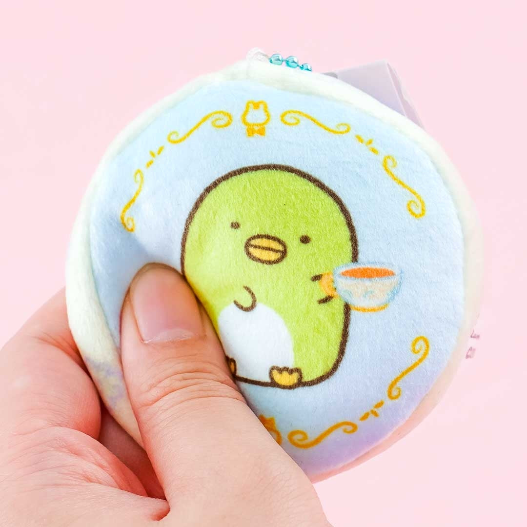 This super kawaii round plushie charm is illustrated with Penguin? from the Sumikko Gurashi drinking tea. Attach it to your favorite bag with its removable ball chain!