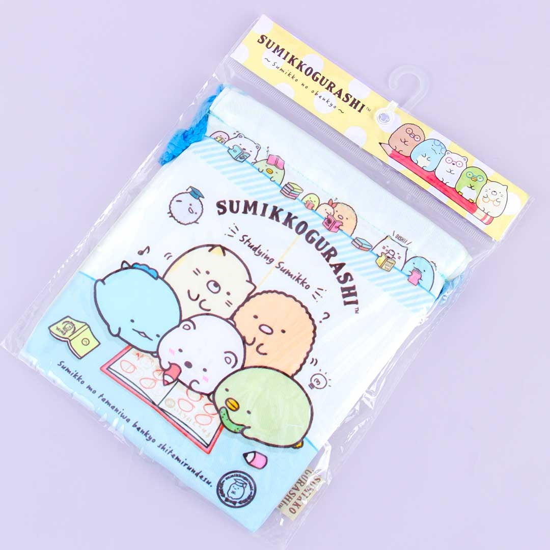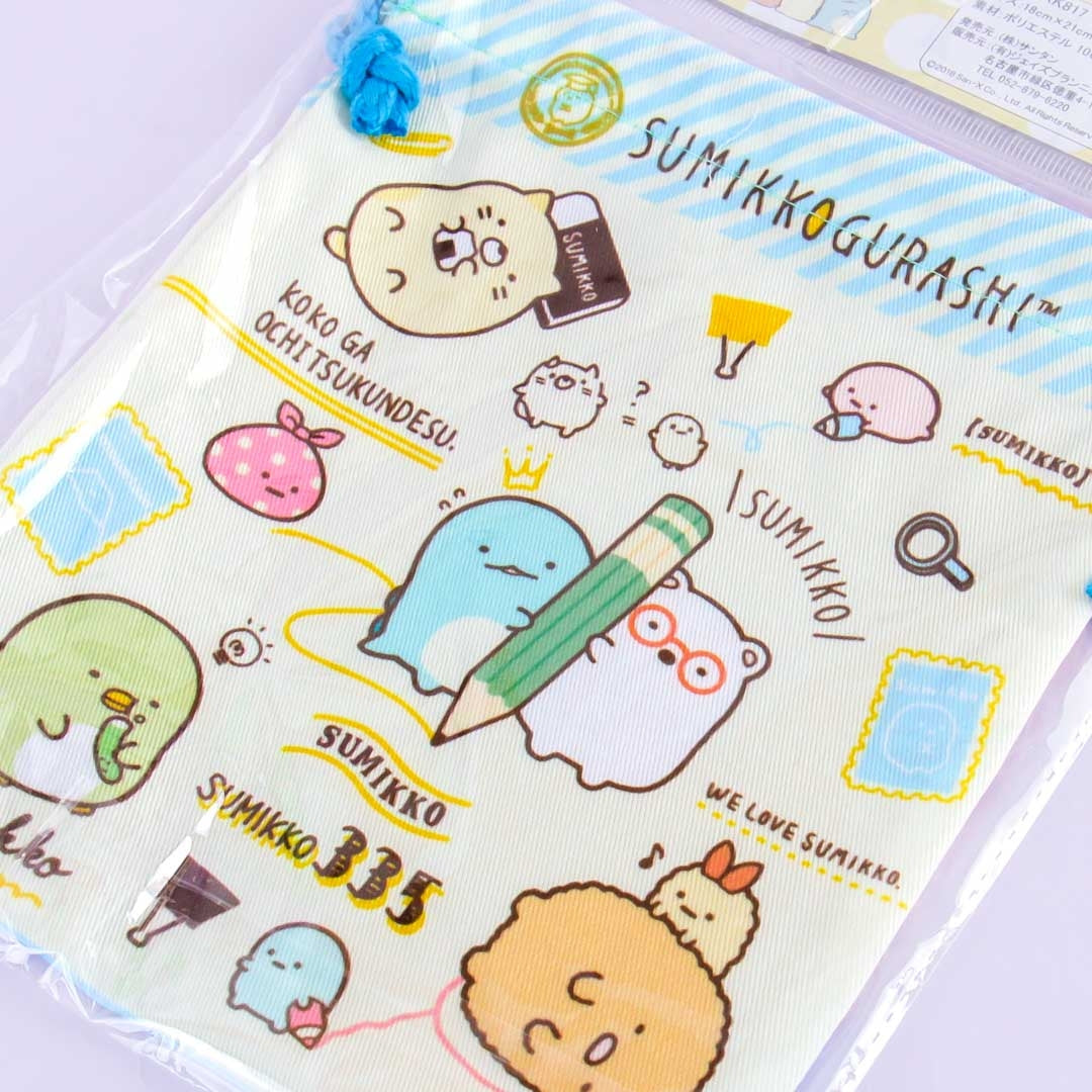 A drawstring bag featuring Sumikko Gurashi characters studying