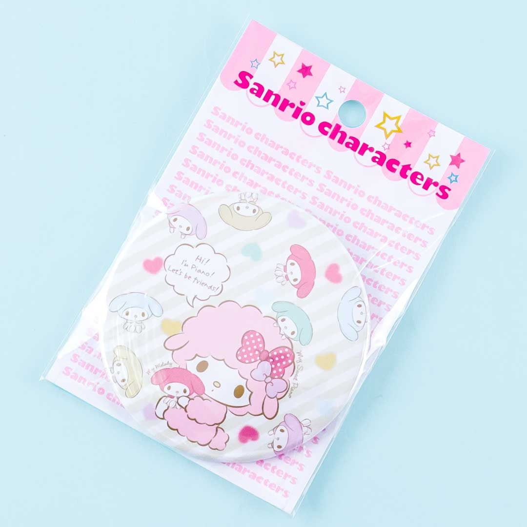 A super cute badge featuring Sweet Piano playing with a My Melody plushie
