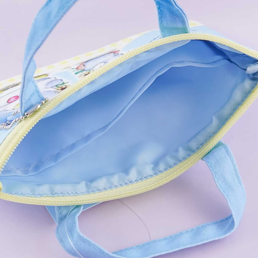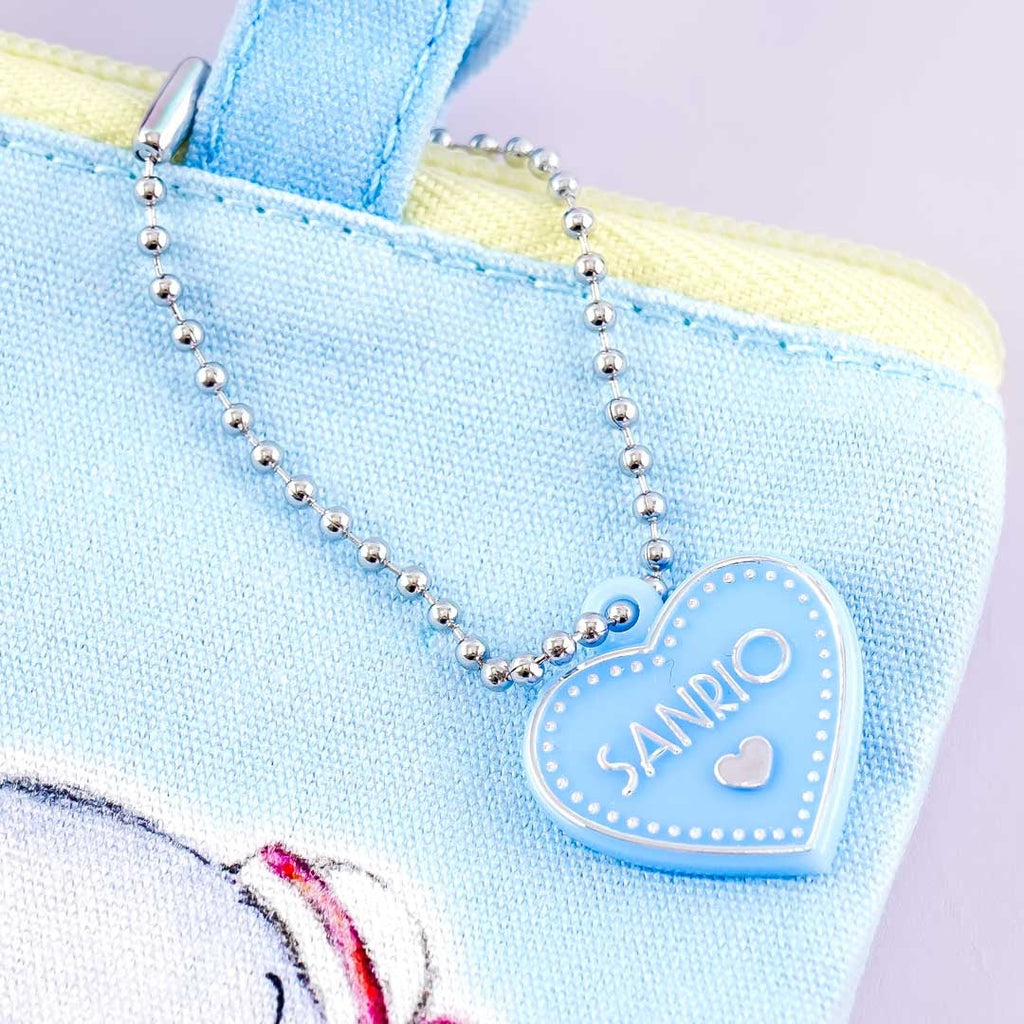 This cute pouch features prints of Tuxedosam picking flowers with a friend! It has a zipper closure, a heart-shaped charm, and two inner compartments. Use this flat pouch to store your bracelets, hair ties, and other knick-knacks!