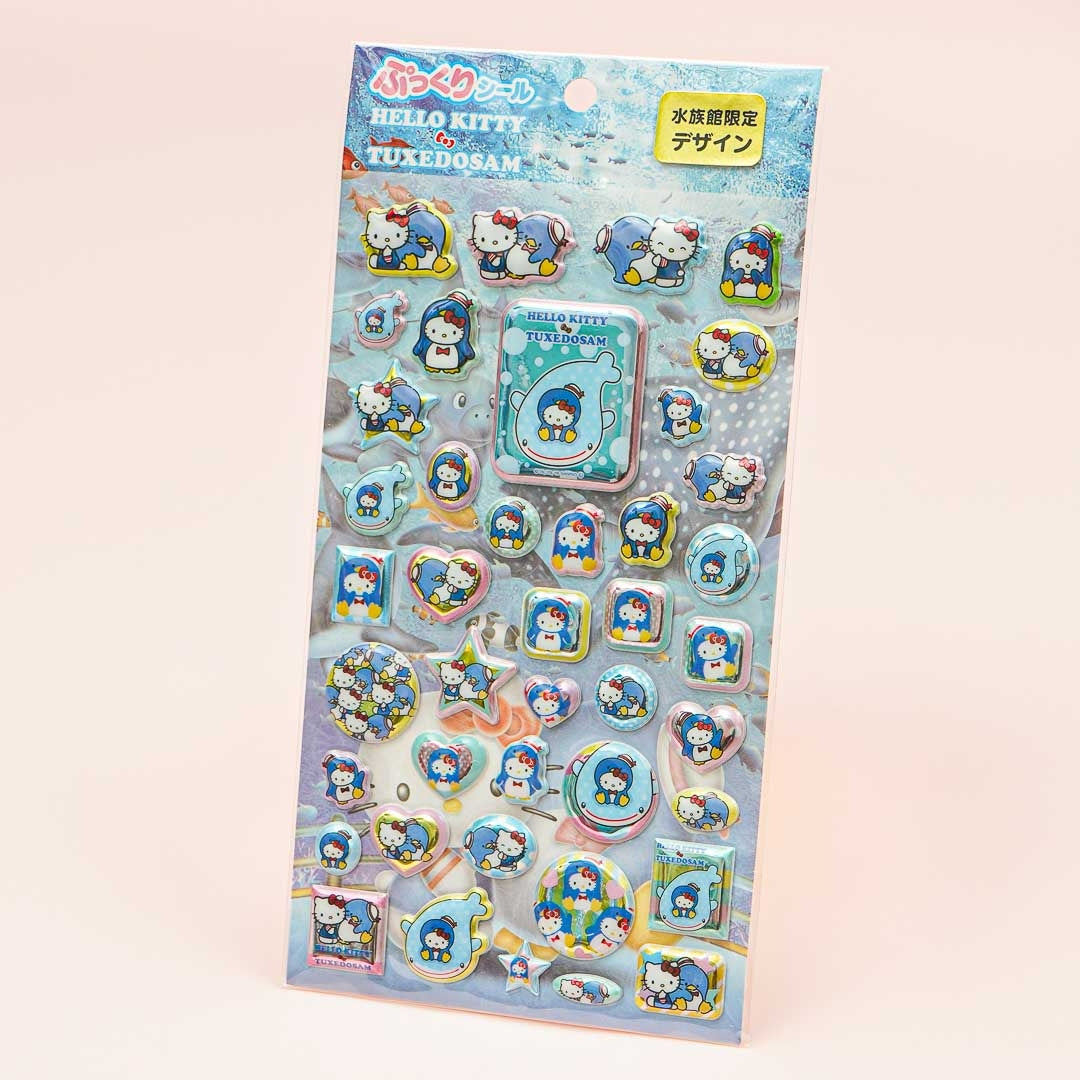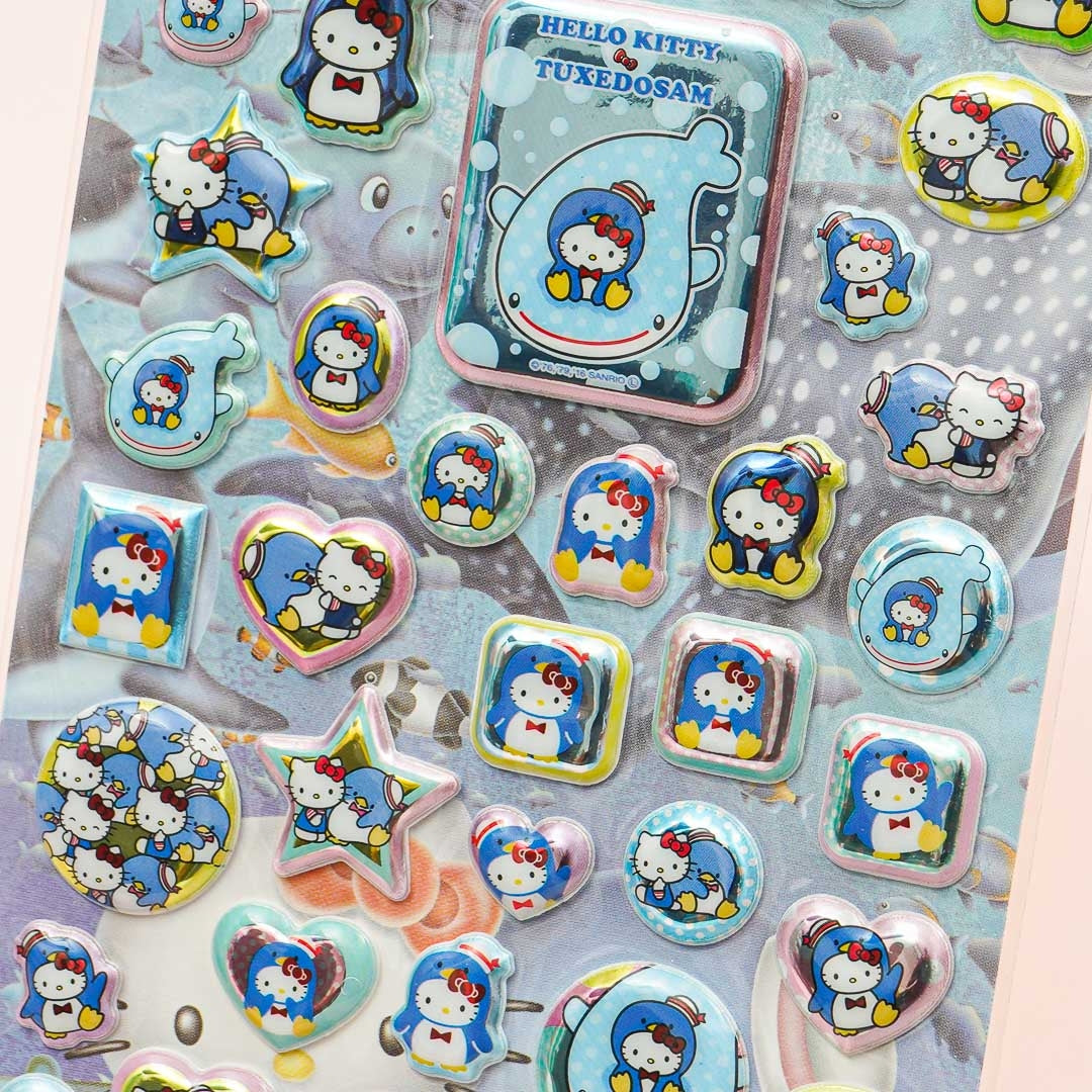 A kawaii sheet of puffy stickers illustrated with Hello Kitty and Tuxeodsam