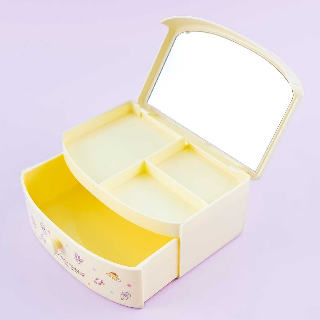 Have fun organizing your favorite trinkets inside this cute yellow jewelry box! It’s decorated with illustrations of Sanrio Characters as café desserts and drinks like pudding, donuts, coffee, and more! This durable plastic case comes with a mirror, a top shelf with several partitions, and a dedicated bottom pull-out drawer.