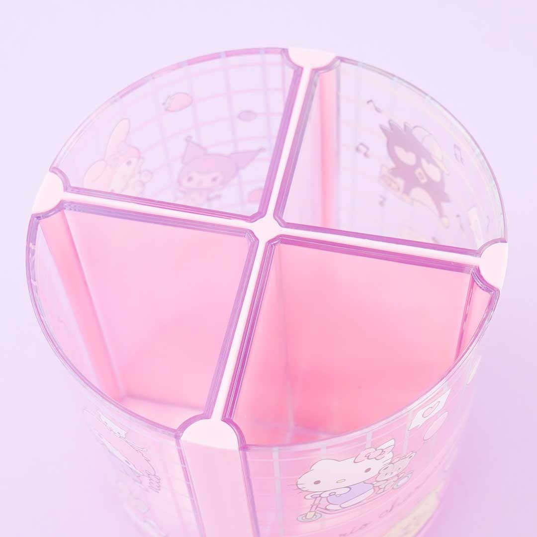 Use this super kawaii rotating pen stand to organize your desk. It's decorated with Sanrio characters having fun hanging out with each other! This pen stand has removable components that make it easy to use.