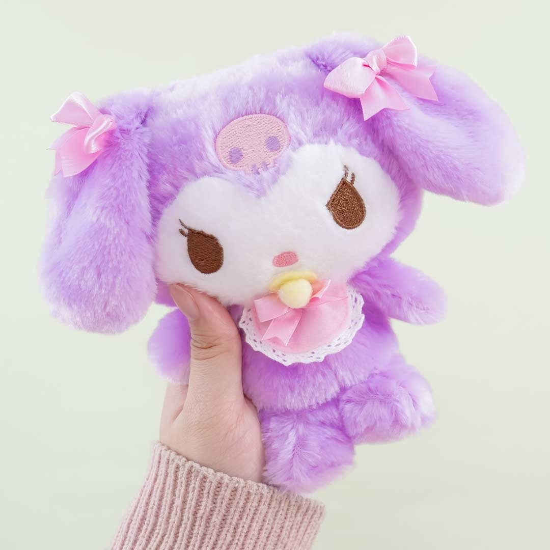 Have fun taking care of baby Kuromi! This medium-sized baby plushie is wearing a cute onesie while sucking on a pacifier. It has bean bag material inside its bottom part.
