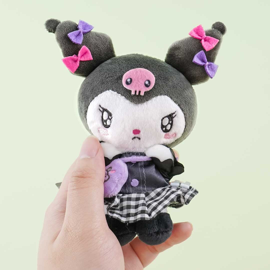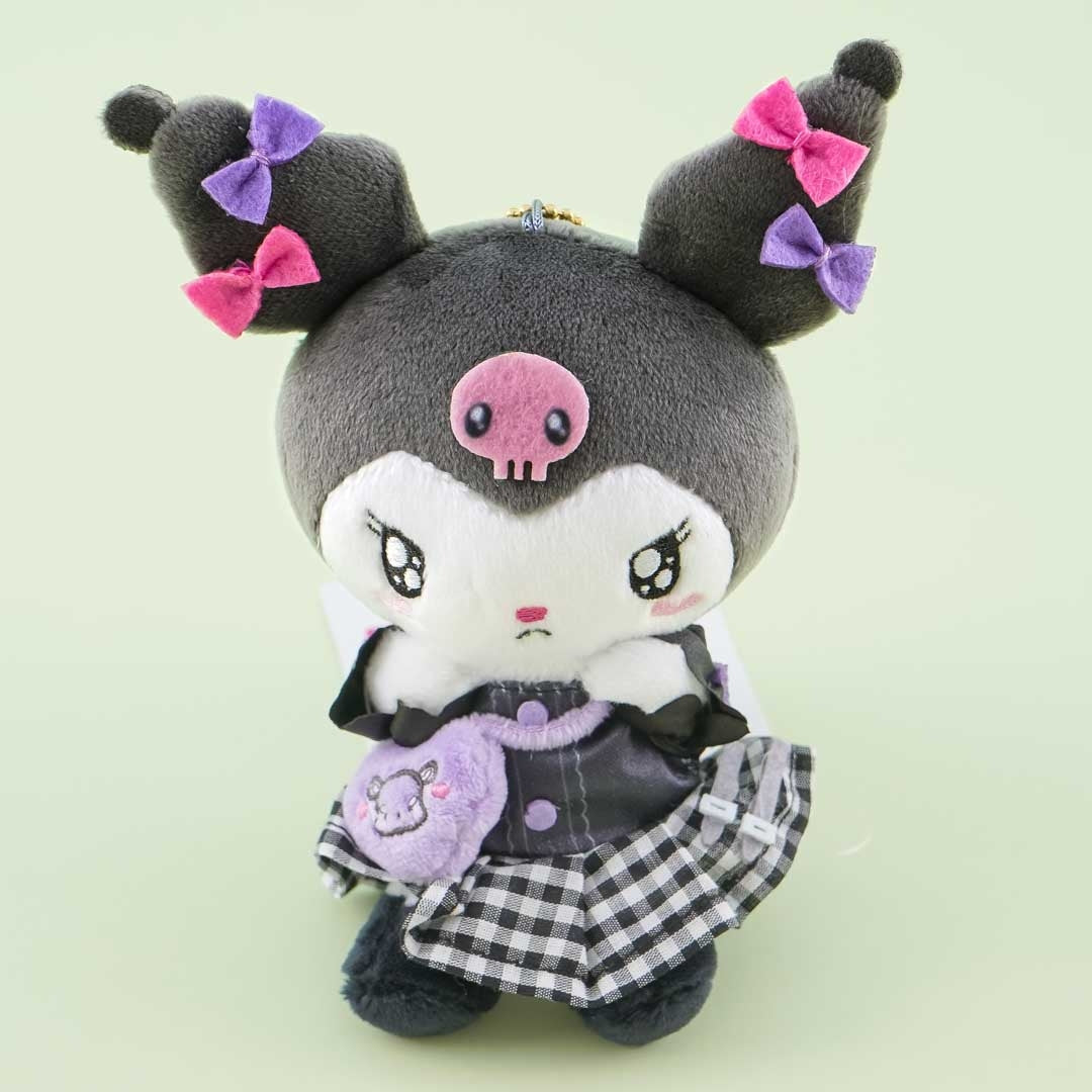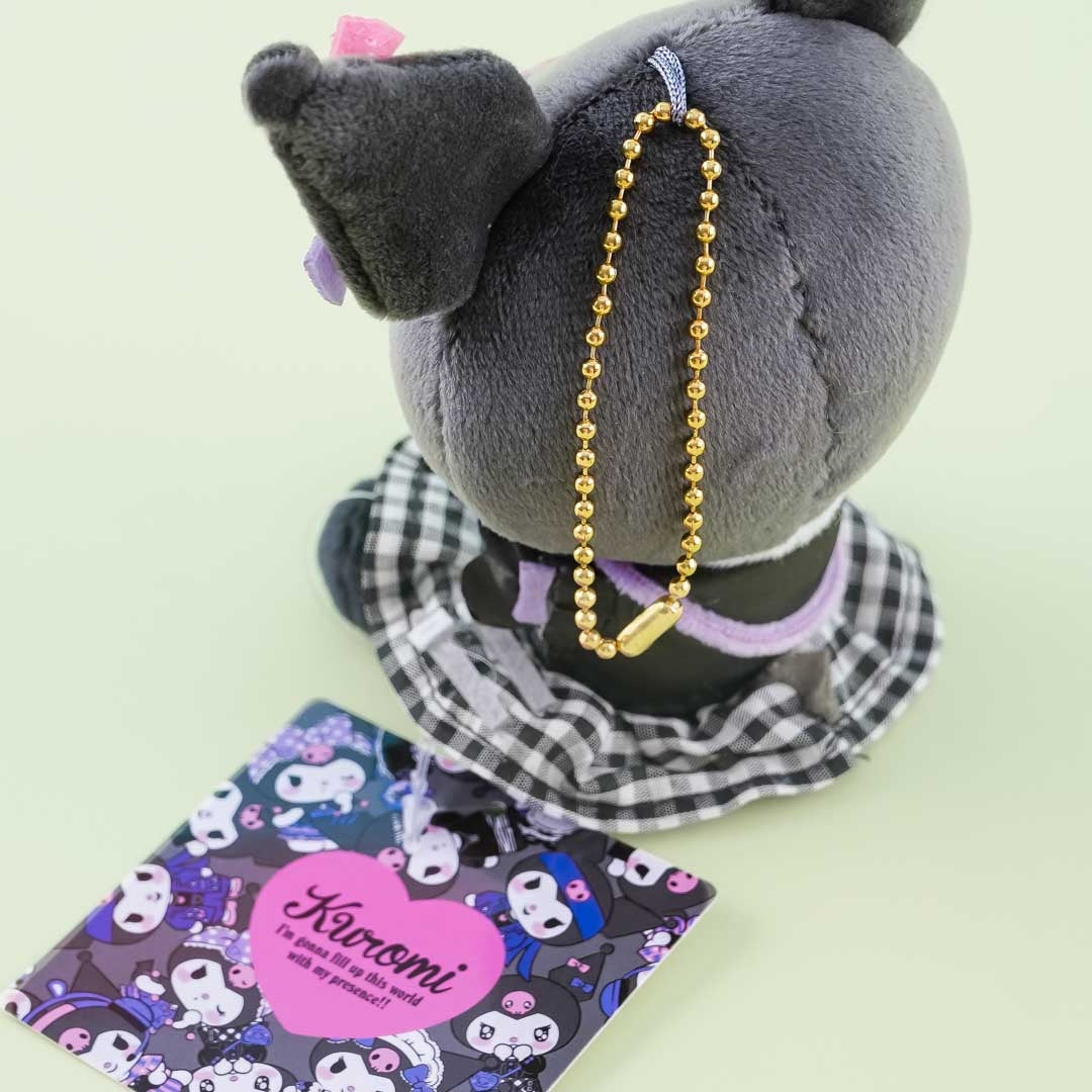 • A kawaii medium-sized Kuromi plushie wearing a checkered skirt