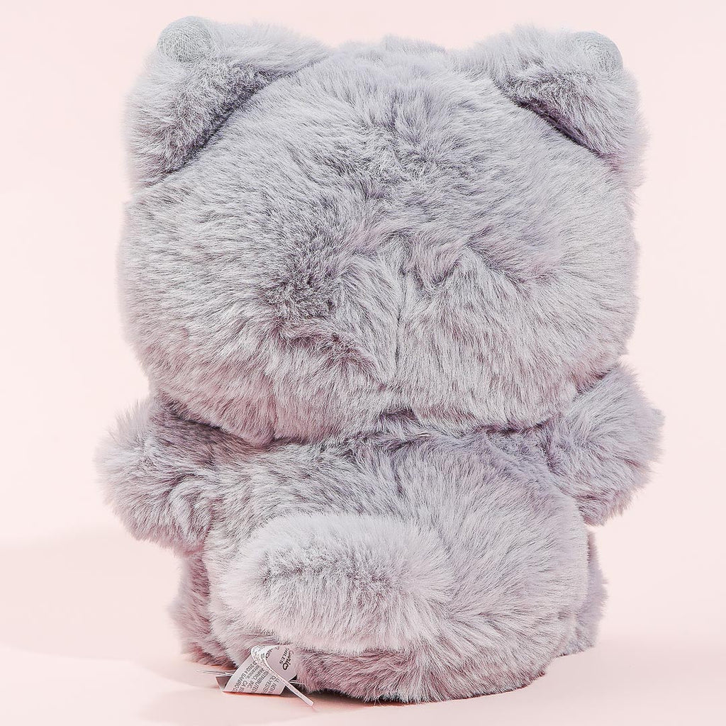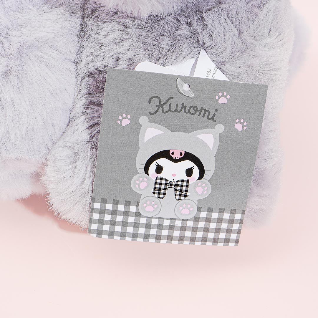 Celebrate Cat Day with this kawaii Kuromi plushie! This medium-sized stuffed toy is dressed in a gray kitty onesie with embroidered paw details and a bushy tail. You can also take it with you to your next slumber party!