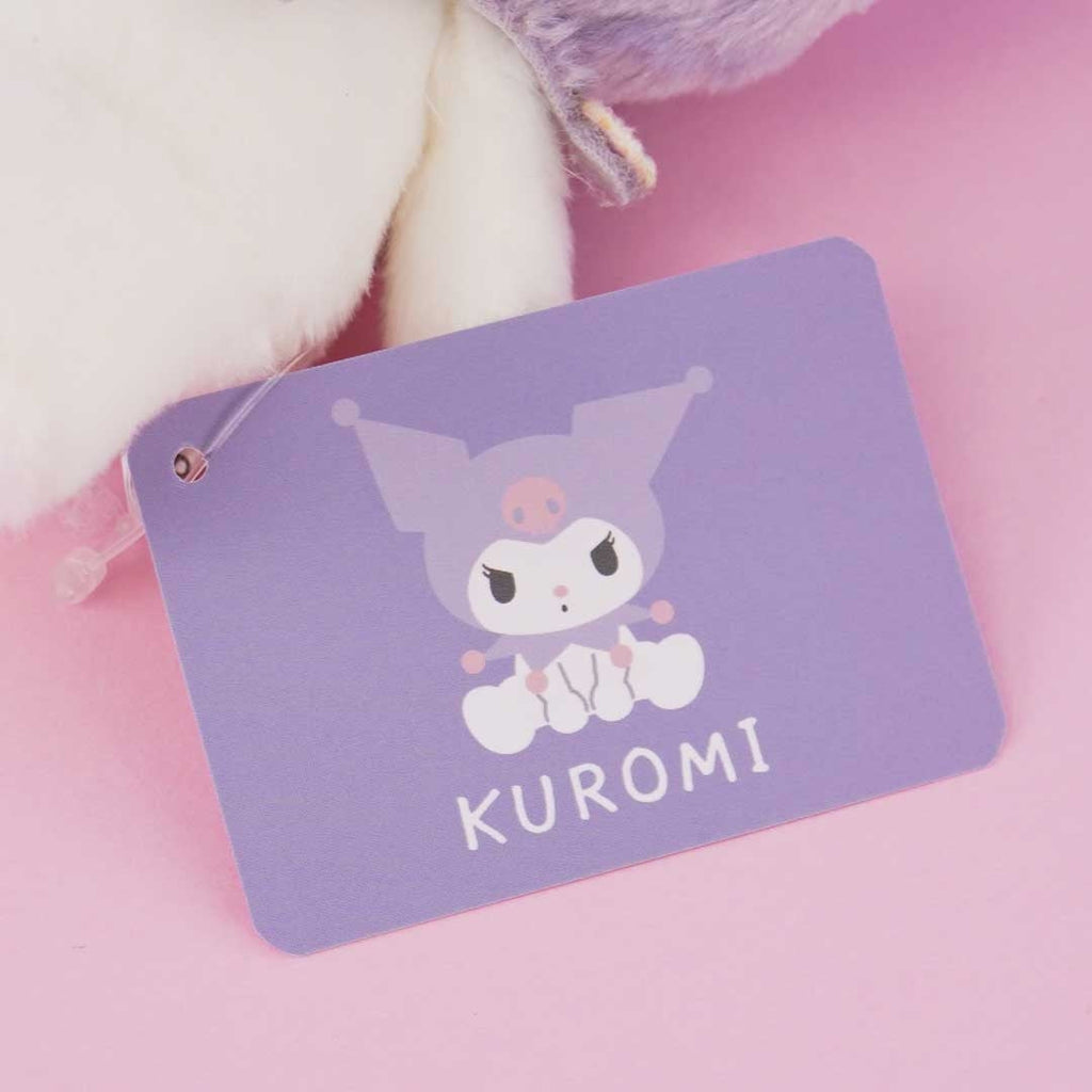 • A super cute medium-sized Kuromi plushie with purple pastel colors and a skull printed on its head