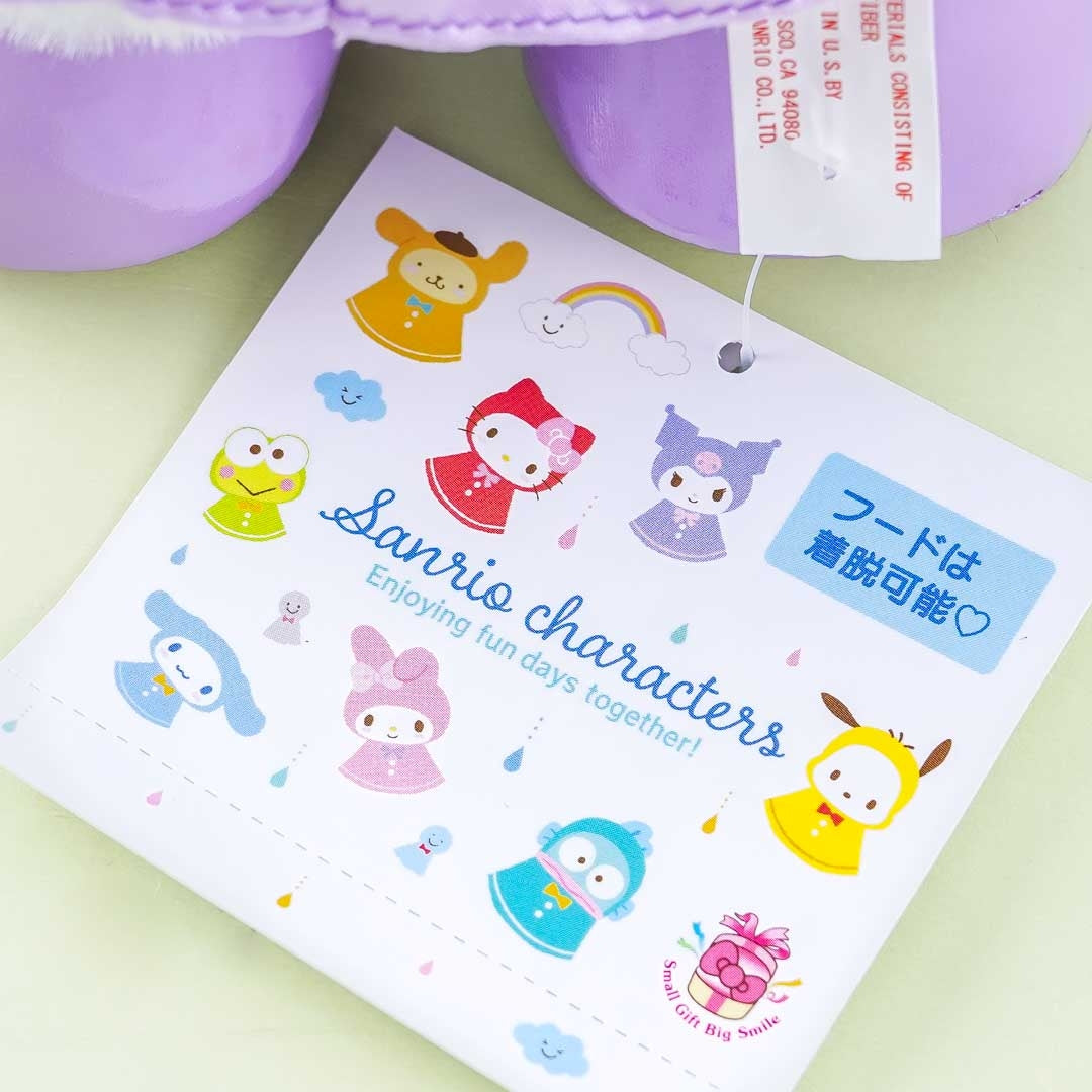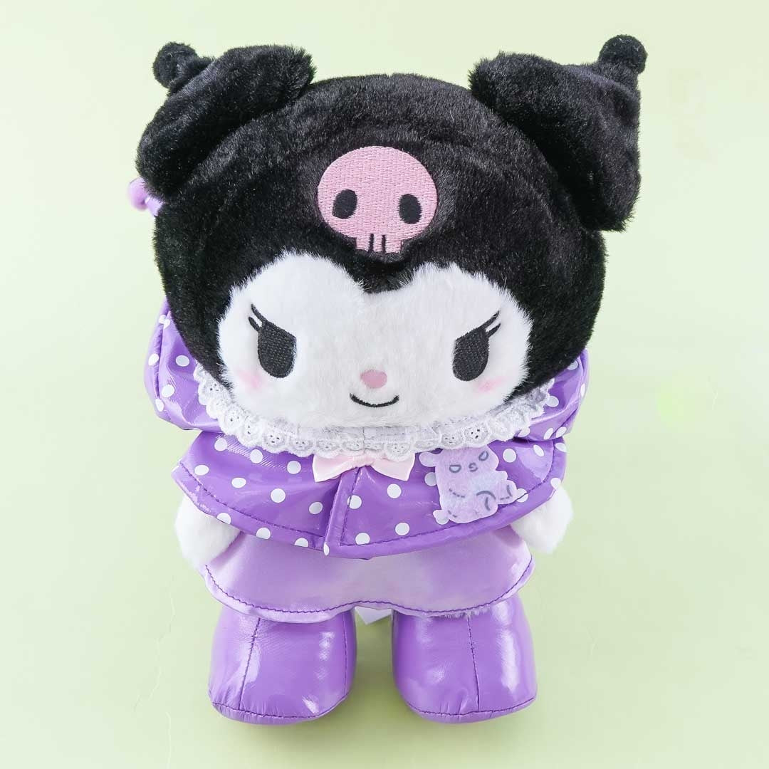Stay indoors and play together with this kawaii Kuromi plushie while it rains outside. This medium-sized cutie is wearing a raincoat with a removable hood!