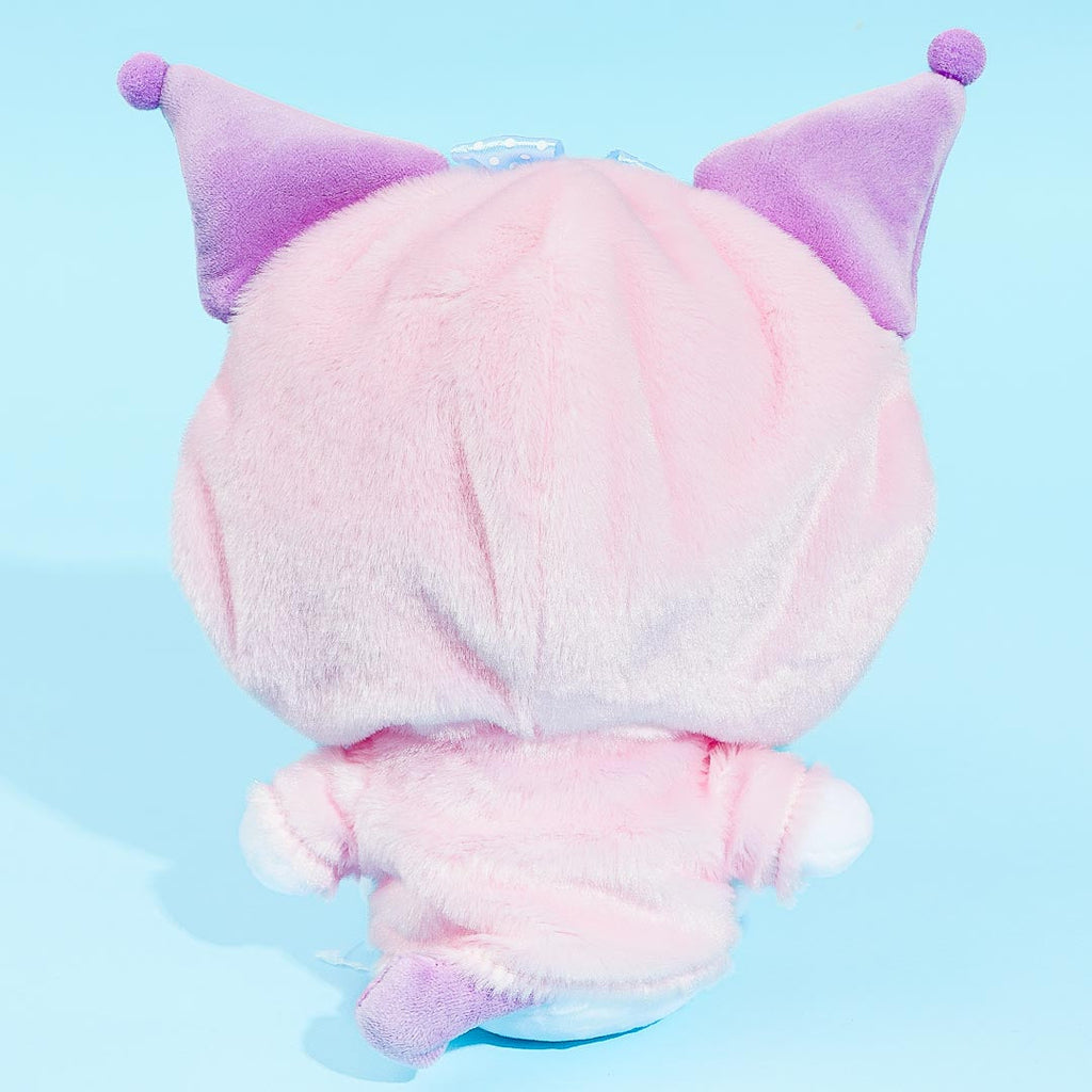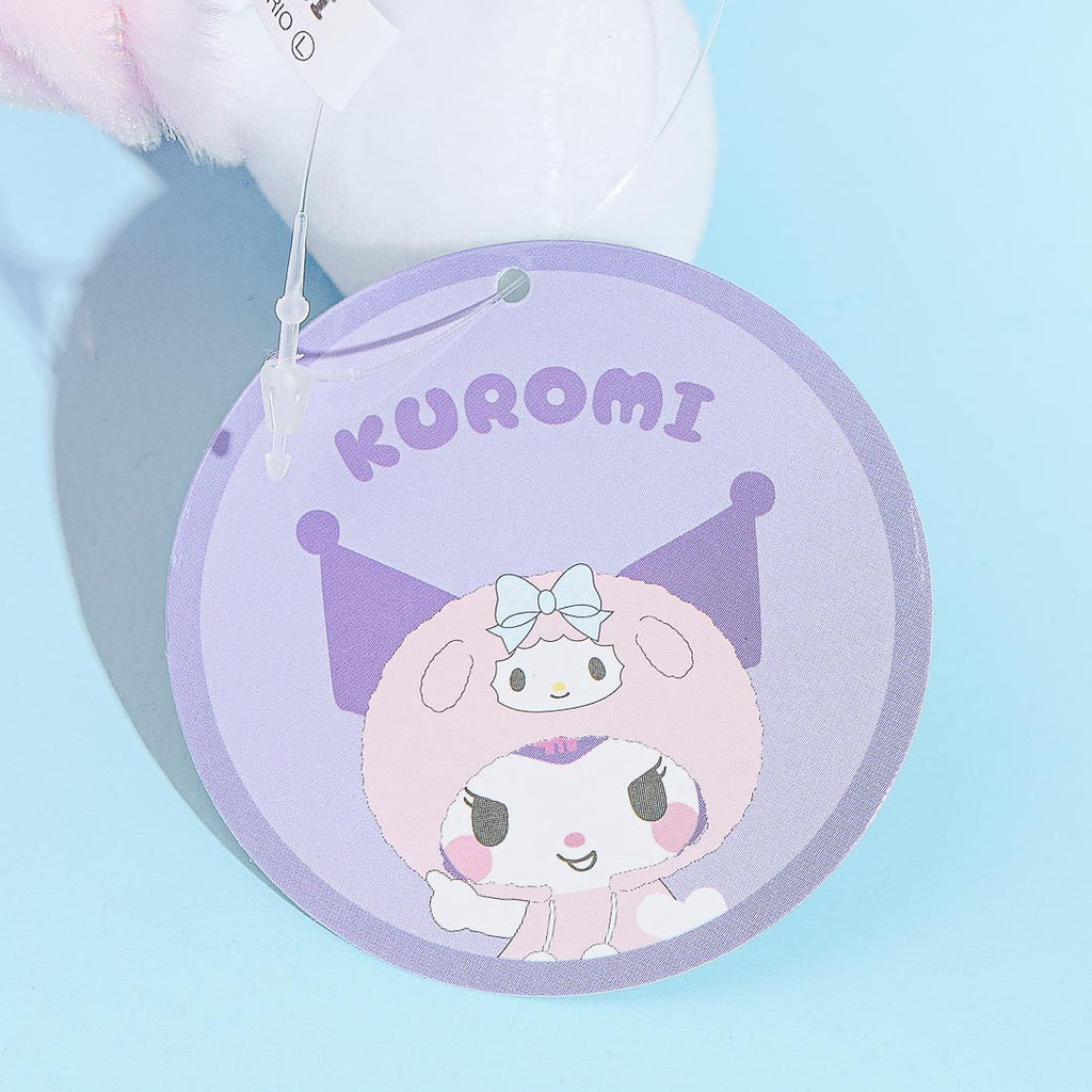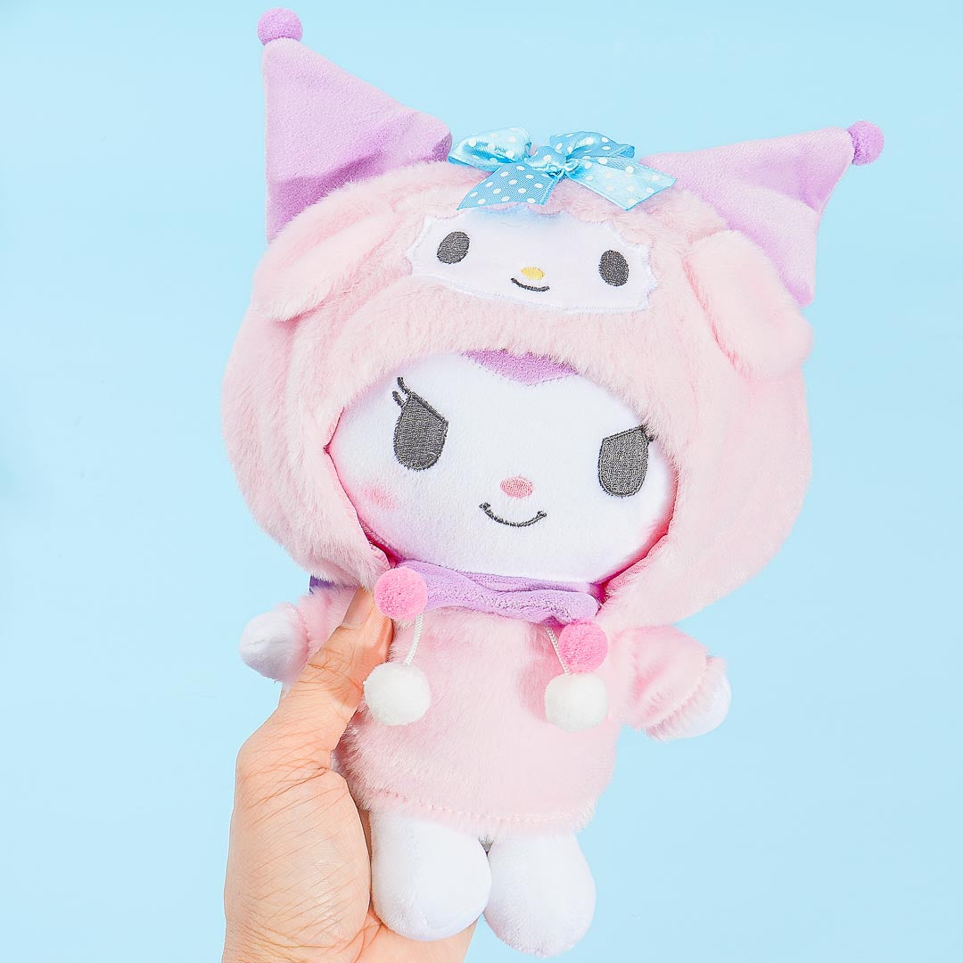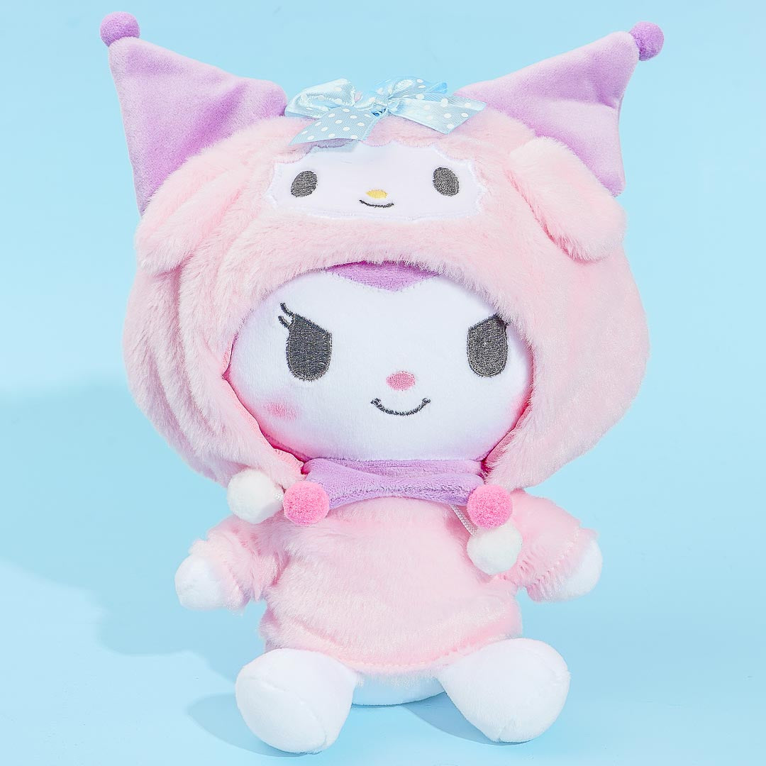 Play dress up with this super kawaii Kuromi plushie. This medium-sized stuffed toy is wearing a hoodie based on her best friend, My Melody! You can remove the hood from her head (though you can't take off the full hoodie).